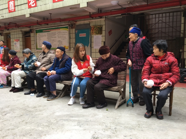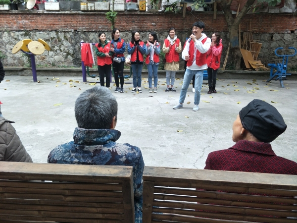 志愿者们来到敬老院,给老人们带去了鲜花与水果以示慰问,仿佛是去见自己的爷爷奶奶一般,他们展现出了自己高昂的热情:同学们为老人们唱歌、跳舞,为敬老院打扫清洁,将年轻一代的活力充分地显露了出来,欢声笑语在院里小坝回荡,黄发垂髫,其乐融融。随后,有的同学拉着老人们的手,与他们聊起了家常;有的同学为老人们剥好水果;有的为他们整理着装。交流中,老人用自己身上发生的事情给同学们讲到传统孝道,慈祥亲切的声音引起了同学们的共鸣,老人们的情感完美的传递到志愿者心中,有的同学甚至留下了感动的泪水。
