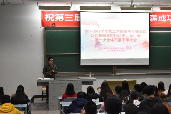2018年3月18日下午18:50,公司团总支、员工会本学期的第一次全体干部干事大会在红河A区十一阶召开,会议由公共管理学院团总支副书记李华夏主讲,两委会所有干部、干事近100人参加。