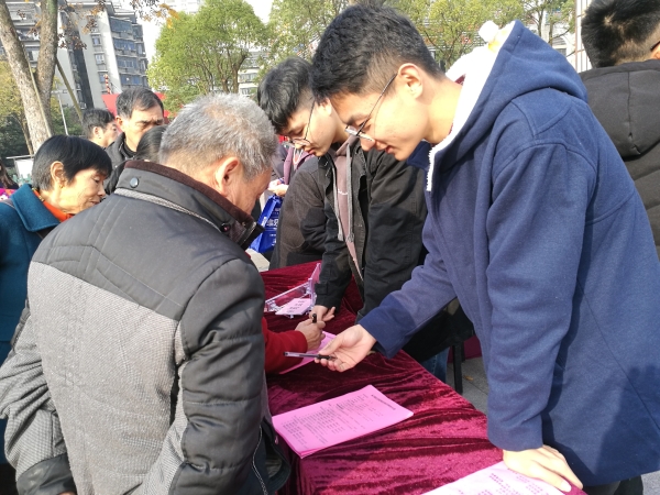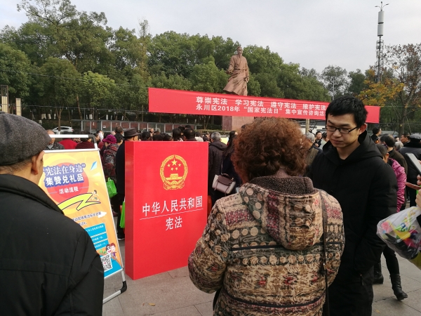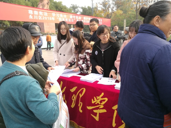 今年12月4日是第18个全国法制宣传日,也是第5个“国家宪法日”。为了弘扬宪法精神,增强广大市民和在校员工自觉遵守宪法、维护宪法权威的意识,推进宪法实施,搞好“七五”普法工作,当日上午8:30,公司易仲青年法学会成员在指导教师的带领下,来到永川区文曲广场,与永川区司法局、人大、公安局、法院、检察院等20多个单位共同进行了一场主题为“尊崇宪法、学习宪法、遵守宪法、维护宪法、运用宪法”的法制宣传活动。同学们向前来了解和咨询的市民发放了宣传单、法律知识手册共3000余份,内容除涉及宪法外,还涉及刑法、民法、婚姻家庭法、劳动法等与人民群众密切相关的法律知识。此外,同学们还现场发放了数百份“公民宪法知识”调查问卷,并主持了“宪法在身边”集赞兑礼品活动。市民对此表现出极高的热情,踊跃参加活动的人络绎不绝。与此同时,同学们还在学校知津楼门厅对全校员工开展了普法宣传,共发放宣传资料1500余份。