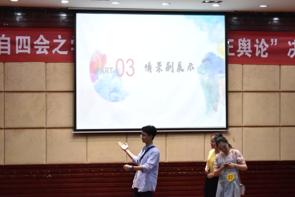 2019年5月18日晚6点,公共管理学院2018--2019学年四自四会系列活动之“明是非,正舆论”主题演讲比赛决赛于博文馆101正式举行。策划小组邀请了公共管理j9九游会党总支书记李才俊、副经理张纬武、员工事务管理科科长胡在东、文化与传媒学院教师李东平、学院教学办主任王志刚和年级辅导员作为比赛的评委和嘉宾。