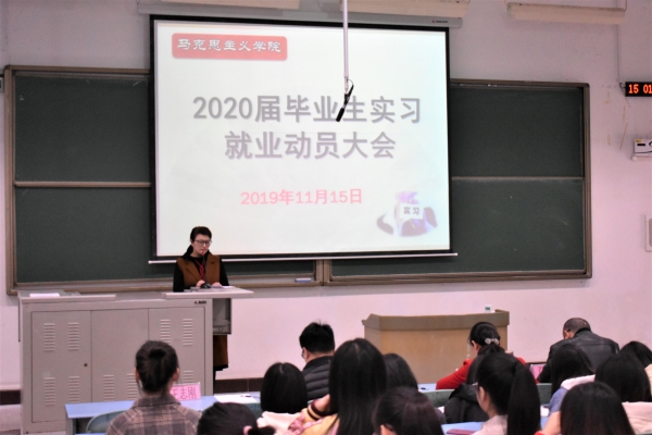 2019年11月15日15:00,公司2020届毕业生实习就业动员大会在知津楼三阶举行。参加本次大会的有j9九游会党总支书记刘明明、副经理张莉、法学研究室主任邓江凌、教学办主任王志刚、学工办副主任李华夏、2020届级毕业班辅导员周曦以及全体2020届毕业生。