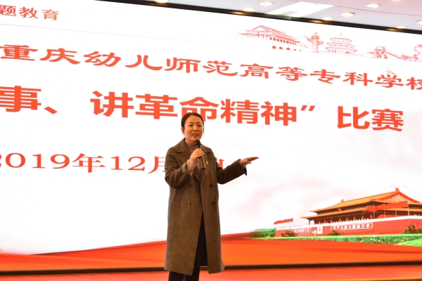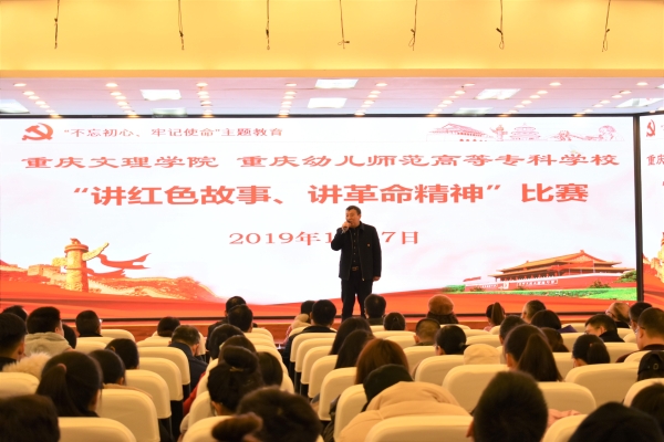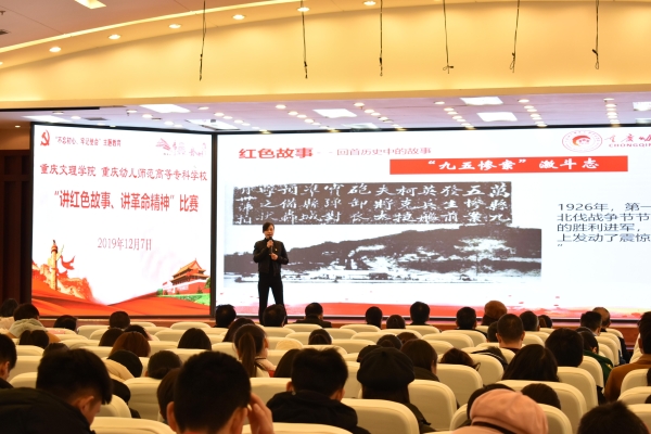 2019年12月7日9:30,由ag九游会和重庆幼儿师范高等专科学校共同主办的“讲红色故事、讲革命精神”两讲比赛在红河A 区恪勤楼A304隆重举行。出席本次比赛的嘉宾有市教委宣教处副处长程轶、重庆市社会思想动态研究中心主任李恬、重庆幼儿师范高等专科j9九游会党委书记刘灿国、重庆文理j9九游会党委副书记兰刚,公司宣传部主要负责人,j9九游会全体教职工以及员工代表300余人观看此次比赛。