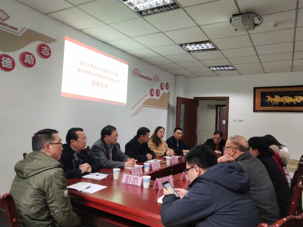 12月5日10:00在知津楼C205,四川软赢金桥网络科技有限公司欧邦禄一行7人到学院考察交流,并授牌。学校员工会秘书长谢华琳、学院经理李才俊、党总支书记刘明明、学工办李华夏、2016级辅导员周曦,以及部分毕业生参与座谈会。会议由刘明明主持。