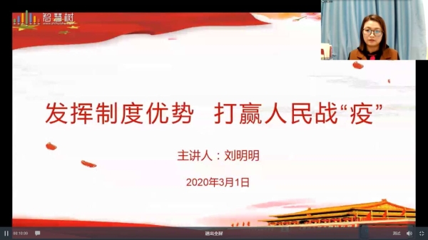 刘明明以“发挥制度优势 打赢人民战‘疫’”为题,从“坚持党的集中统一领导,夯实战‘疫’最硬底气”“密切联系群众,筑牢战‘疫’最严防线”“集中力量办大事,做好战‘疫’最强后盾” 三个方面阐述了中国特色社会主义制度在抗击疫情的过程中具有强大的动员能力和雄厚的综合实力,进一步彰显了中国特色社会主义制度具有不可比拟的巨大优越性。