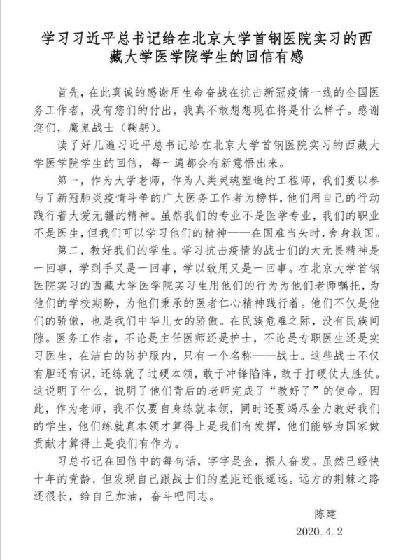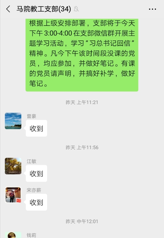 4月2日15:00,公司教工党支部全体党员在支部微信群里举行了主题为“学习回信精神 做好育人工作”的组织生活会,大家集中学习了2月21日习近平总书记给在首钢医院实习的西藏大学医学院员工的重要回信精神。