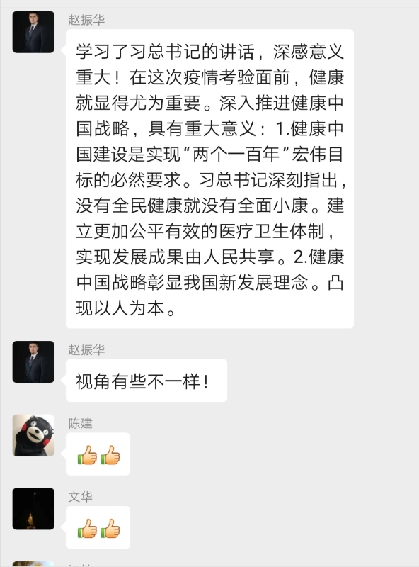 然后,教师党员赵振华、陈建、冉平海同志作了主题发言。赵振华同志从“健康中国”的角度谈了健康的重要性,他认为,健康中国建设是实现“两个一百年”宏伟目标的必然要求,没有全民健康就没有全面小康,为此需要建立更加公平有效的医疗卫生体制,实现发展成果由人民共享。陈建同志从“教师使命”的角度谈了培养优秀人才的重要意义,他认为,教师是人类灵魂塑造的工程师,要培养员工的奋斗精神和敬业精神,教育员工以疫情中的广大医务工作者为榜样,践行大爱无疆、舍身救国的精神,同时也要教育员工练就真本领,发挥真本事,为国奉献才会更有作为。冉平海同志从“感恩”的角度阐述了报效祖国的话题,他认为,感恩是做人的基本准则,我们要教会员工感恩,感谢祖国的培养,教育员工学好本领后报效祖国、建设家乡。