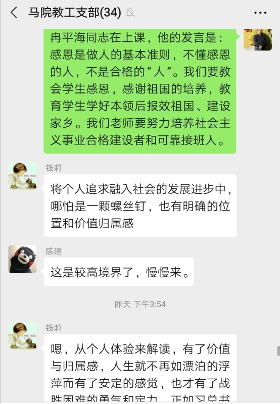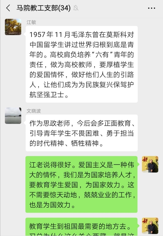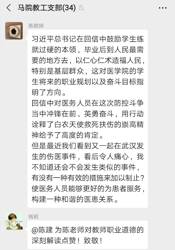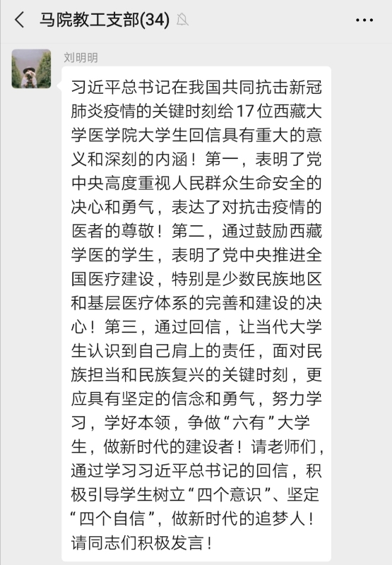 主题发言之后,同志们进行了自由讨论交流,大家普遍认为,习近平总书记在回信中鼓励员工练就过硬的本领,毕业后到人民最需要的地方去,以仁心仁术造福人民,这为广老员工的职业规划以及奋斗目标指明了方向。高校肩负培养优秀人才的责任,作为高校教师,要厚植员工的爱国情怀,做好他们人生的引路人,教育员工把个人理想、个人命运与国家前途命运相结合,让他们成为为民族复兴保驾护航坚强卫士。