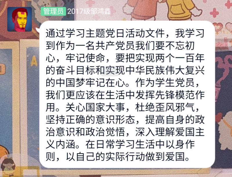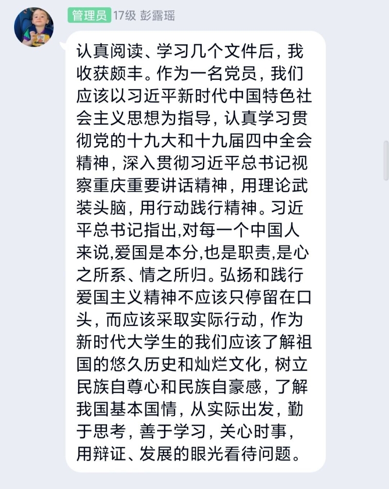 首先三位老师就《学习宣传贯彻落实<新时代爱国主义教育实施纲要>工作方案》和《孙书记在2020年全面从严治党工作会上的讲话》、《罗茂在2020年全面从严治党视频工作会上的讲话》在5月27日上午进行了布置,对员工党员提出了学习要求,要求员工党员加强政治学习,增强责任意识,提高责任能力,不断进行自我反思、自我警醒,做一个忠于国家,忠于人民的新时代老员工党员。