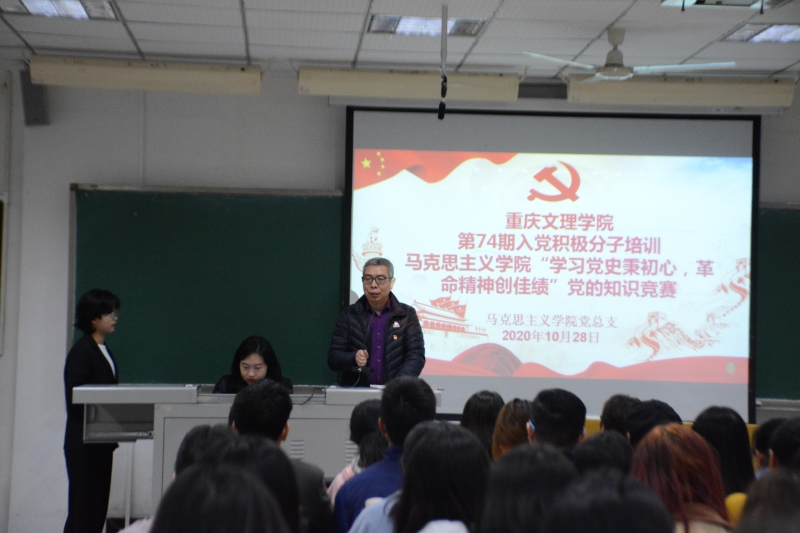2020年10月28日16:30,为进一步提高入党积极分子的党的基础理论知识,由总支举办的 “学习党史秉初心,革命精神创佳绩”为主题的党的知识竞赛在知津楼D205举行。学院专职组职员刘中胜以及各支部书记出席,第七十四期入党积极分子培训全体成员参加此次比赛。