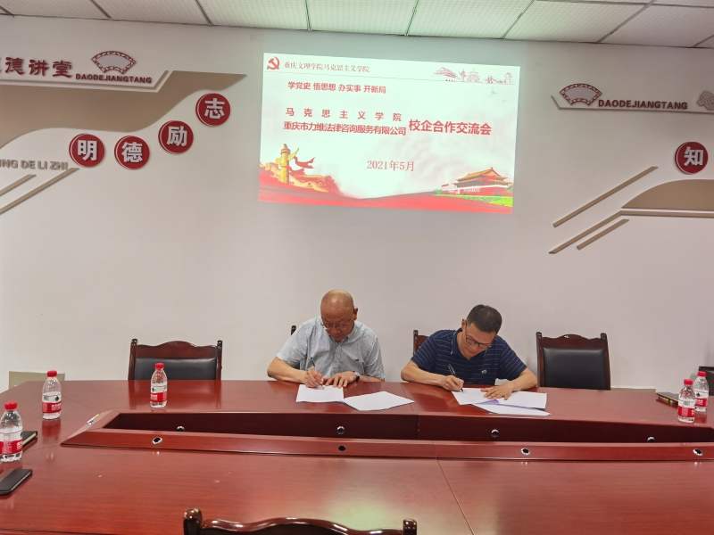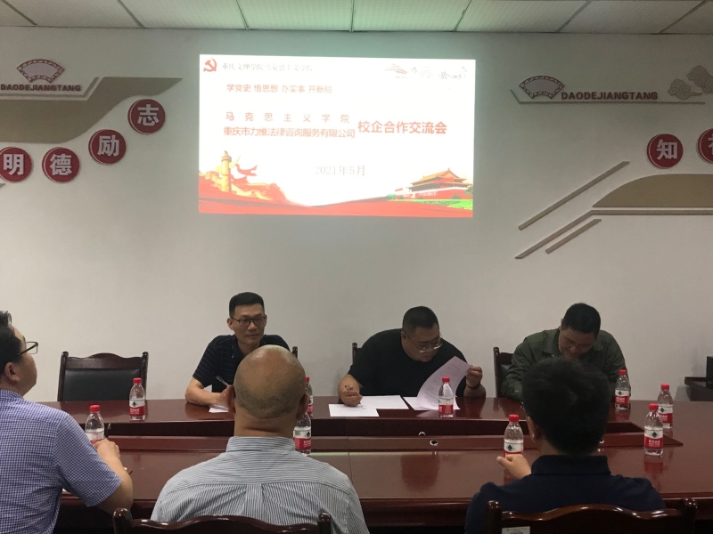 5月14日下午,公司与重庆市力维法律咨询服务有限公司在知津楼C205会议室进行了校企合作交流会。重庆市力维法律咨询服务有限公司经理蔡兴雨、乔勇、何江及公司经理李才俊、副经理胡守敏、客座教授吕凤国、法学教研室主任邓江凌等出席了本次会议。