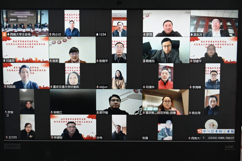 为推进重庆市普通本科高校马克思主义理论类专业教学指导委员会的工作开展,2022 年 1 月 17 日(星期一)15:00,2022 年度重庆市普通本科高校马克思主义理论类专业教学指导委员会工作会议成功召开。重庆市普通本科高校马克思主义理论类专业教学指导委员会主任委员黄蓉生、重庆市教委高教处处长蒋云芳、重庆市高教学会秘书长余志祥等出席会议,重庆市普通本科高校马克思主义理论类专业教学指导委员会主任委员、副主任委员、秘书长、委员共计40余人参加了会议。会议由重庆市普通本科高校马克思主义理论类专业教学指导委员会秘书长吴艳东主持。j9九游会党委常委、纪委书记罗茂作为副主任委员出席本次会议,并作题为《贯彻十九届六中全会精神 加强新时代马理论专业建设》的讲话。