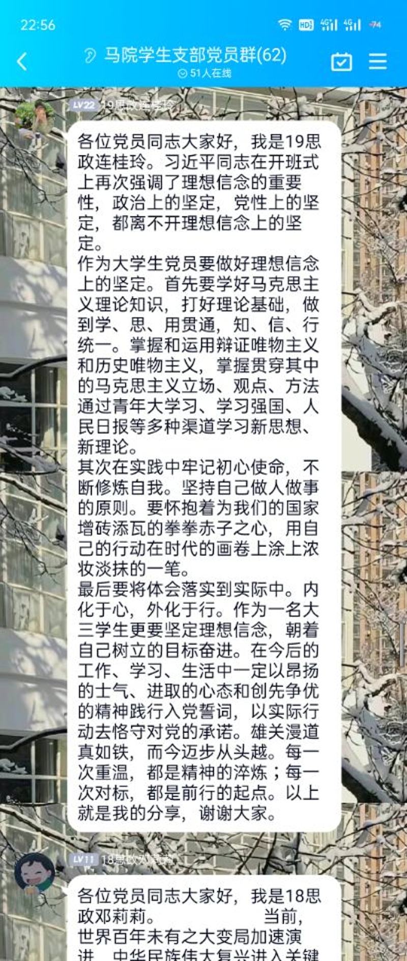 会议开始,李华夏讲到此次主题党日在当前疫情防控背景下具有重要意义,各党员同志要高度重视、认真学习。随后由员工党员王法森、康松作为领学人,带领全体党员就“习近平总书记在中央党校(国家行政学院)中青年干部培训班开班式上的重要讲话精神”围绕坚定信念、守住清廉、锤炼党性等七个方面内容的深入学习。领学结束后,教师党员和员工党员先后积极发言,充分表达了自己愿做新时代无畏者、新形势坚守者、新征程奋进者的勇气和决心。