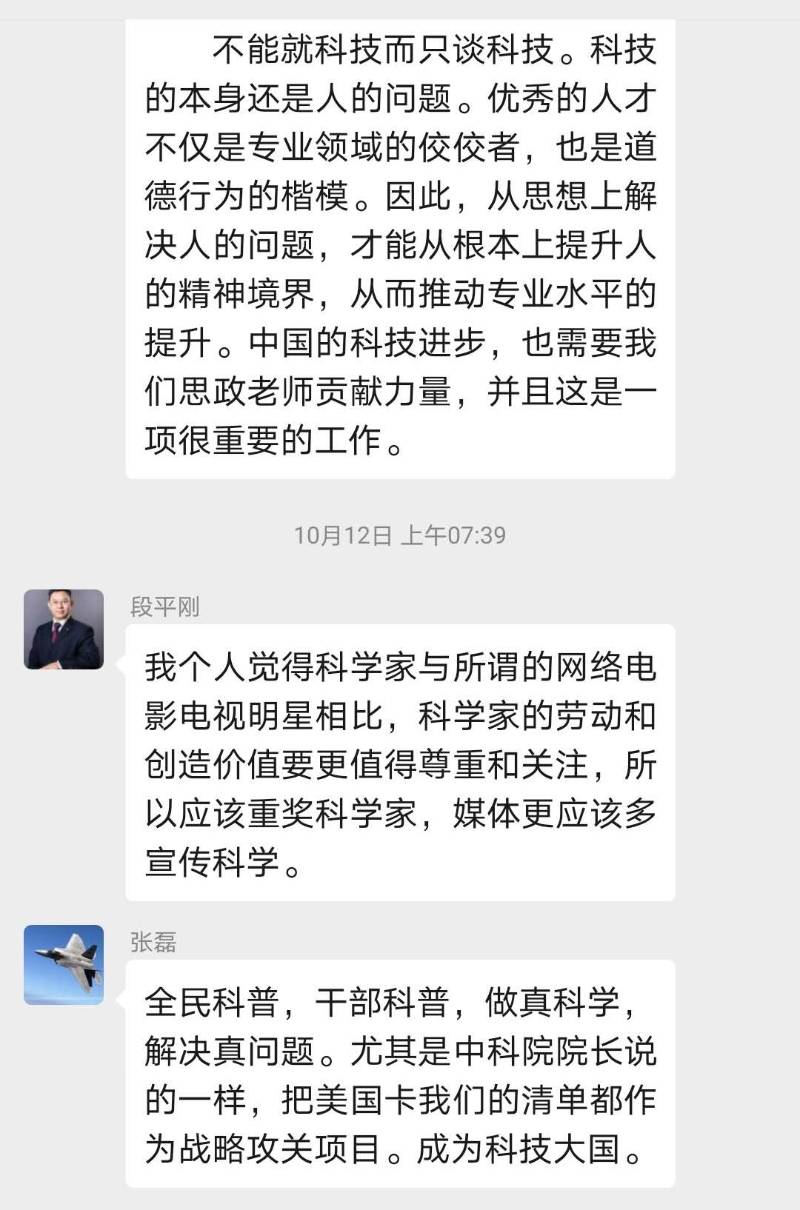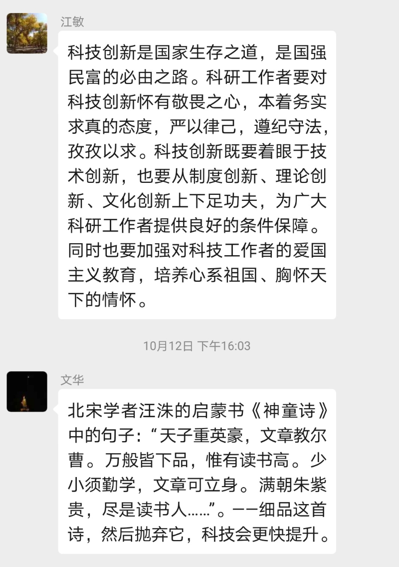 同志们围绕主题开展讨论,大家的目光主要聚焦于科技发展问题。段平刚同志强调要尊重和关注科学家的劳动和创造,媒体对此应加大宣传力度。张磊同志认为,要开战全民科普,做真科学,解决真问题,把美国卡我们的清单都作为战略攻关项目。王开武同志认为,科技的竞争最终要落实到各个国家科学家的竞争,如何为科学家营造良好的环境至关重要。江敏同志谈到,科技创新既要着眼于技术创新,也要从制度创新、理论创新、文化创新上下足功夫,同时要加强对科技工作者的爱国主义教育,培养心系祖国、胸怀天下的情怀。同志们还对践行勤俭节约美德进行了讨论。