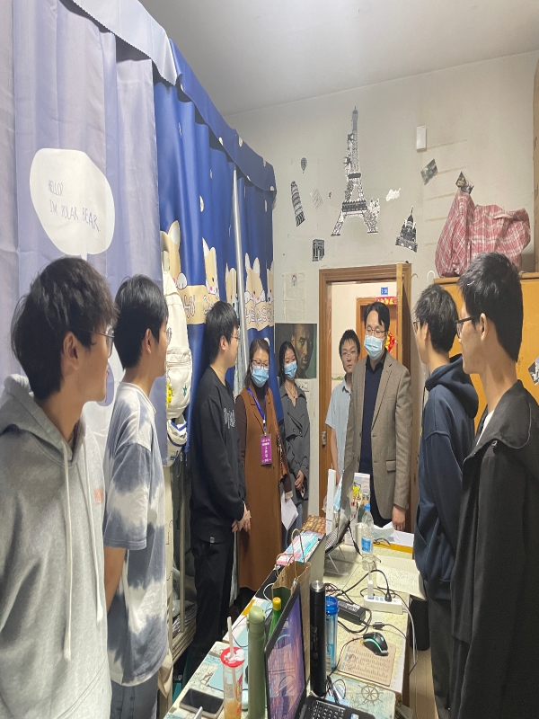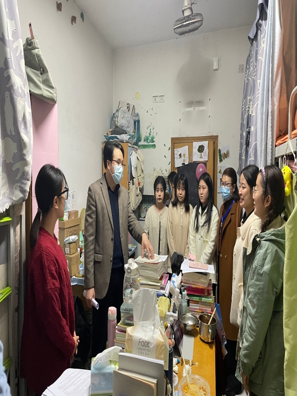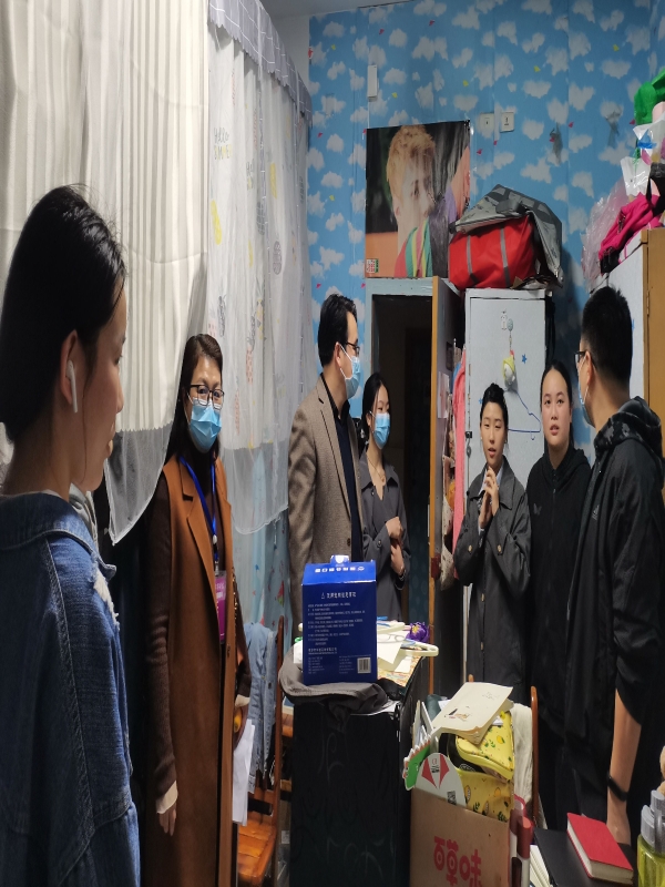 为积极落实学校疫情防控要求,进一步做好常态化疫情防控工作,及时了解员工思想动态、学习状况、身心状态。2022年11月22日18:00,学院经理胡守敏、党总支书记刘明明、学工办主任李华夏走访学院部分宿舍。