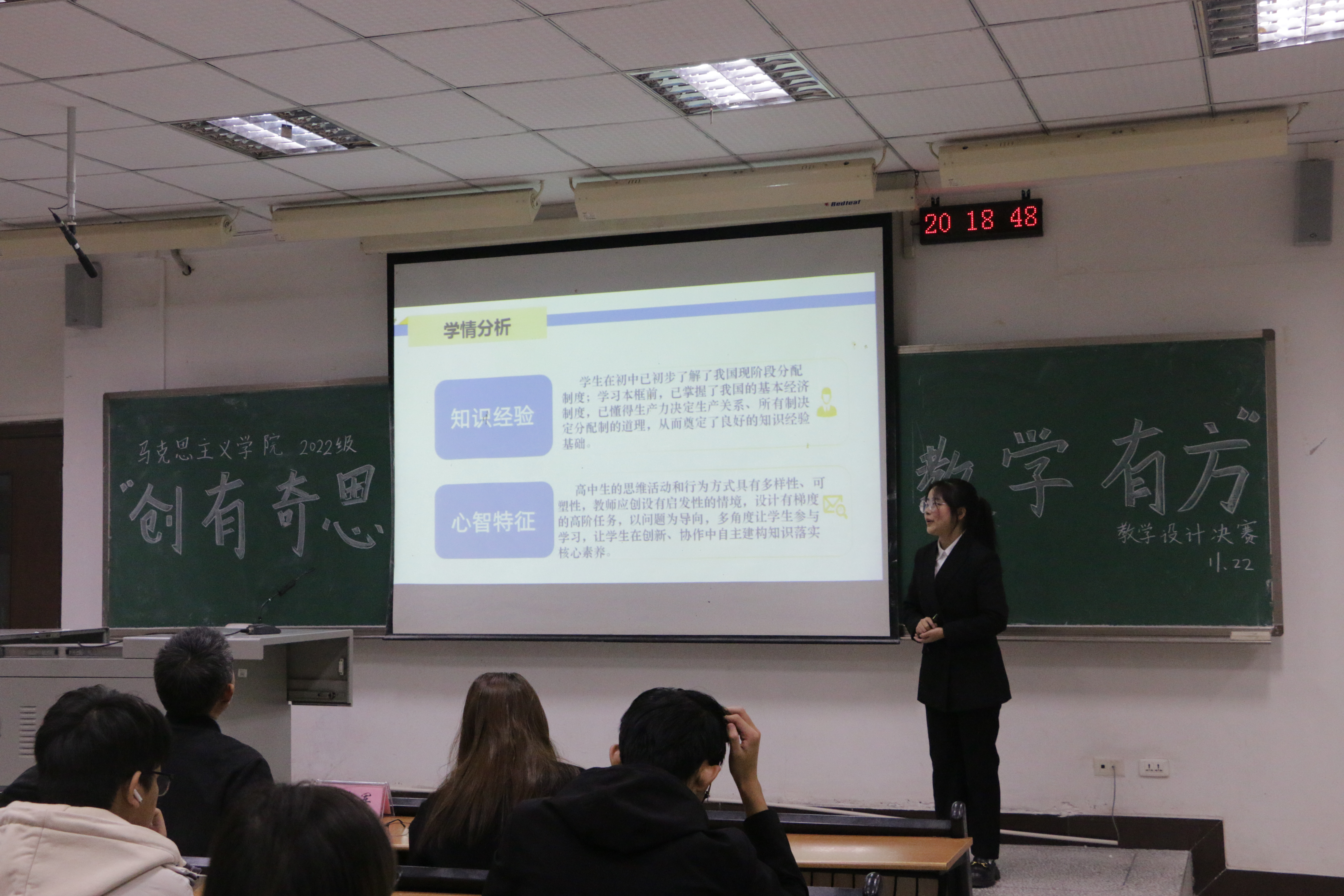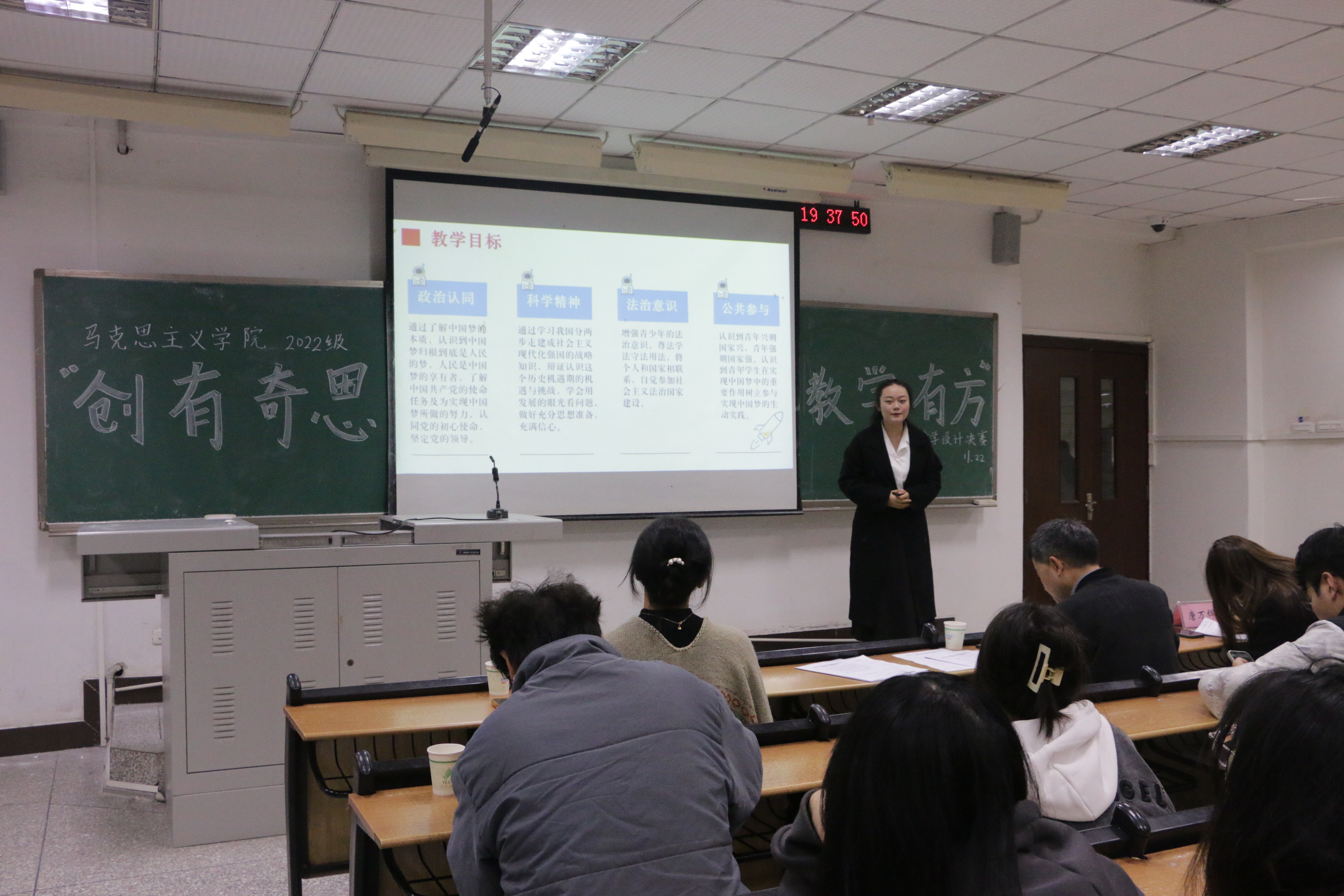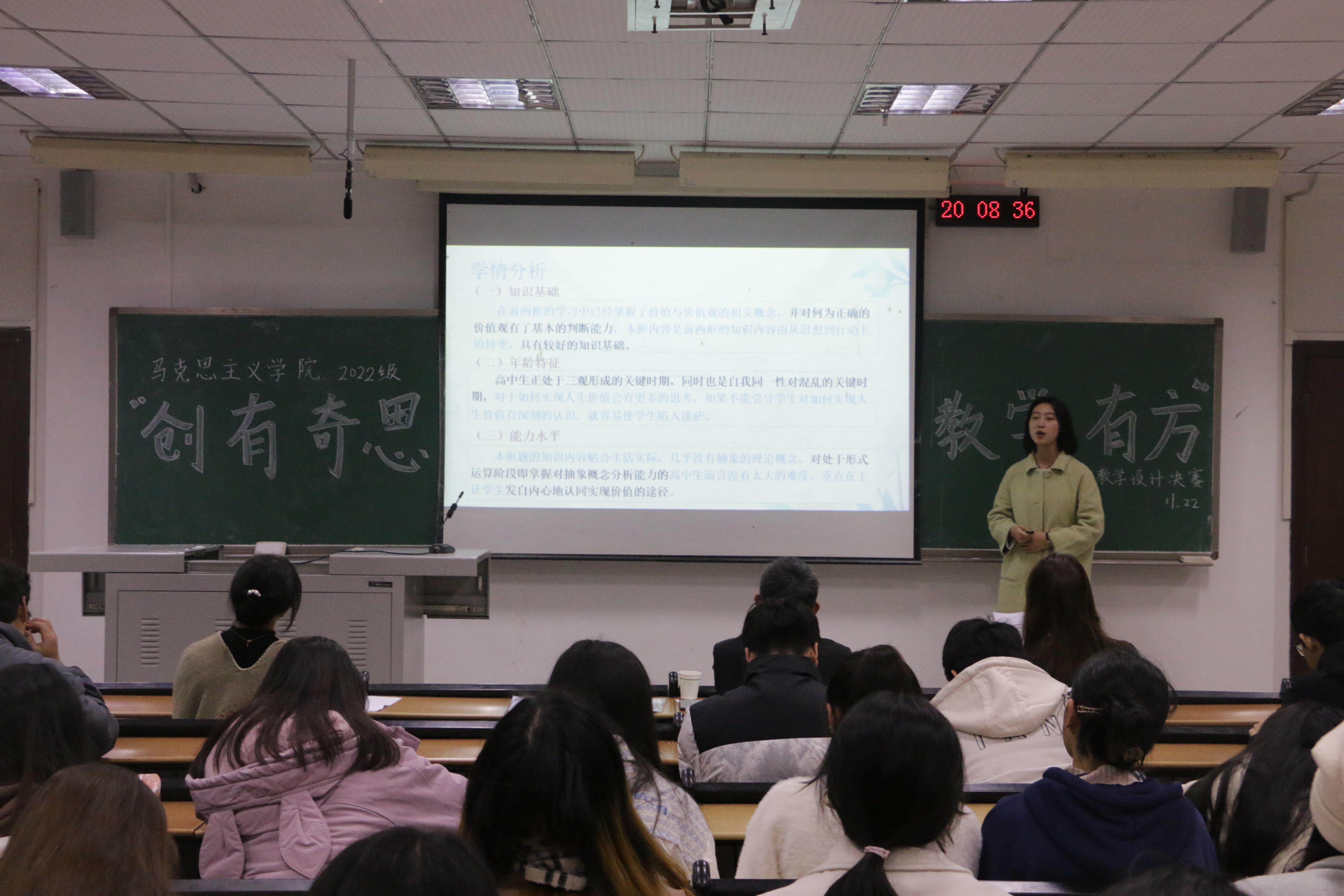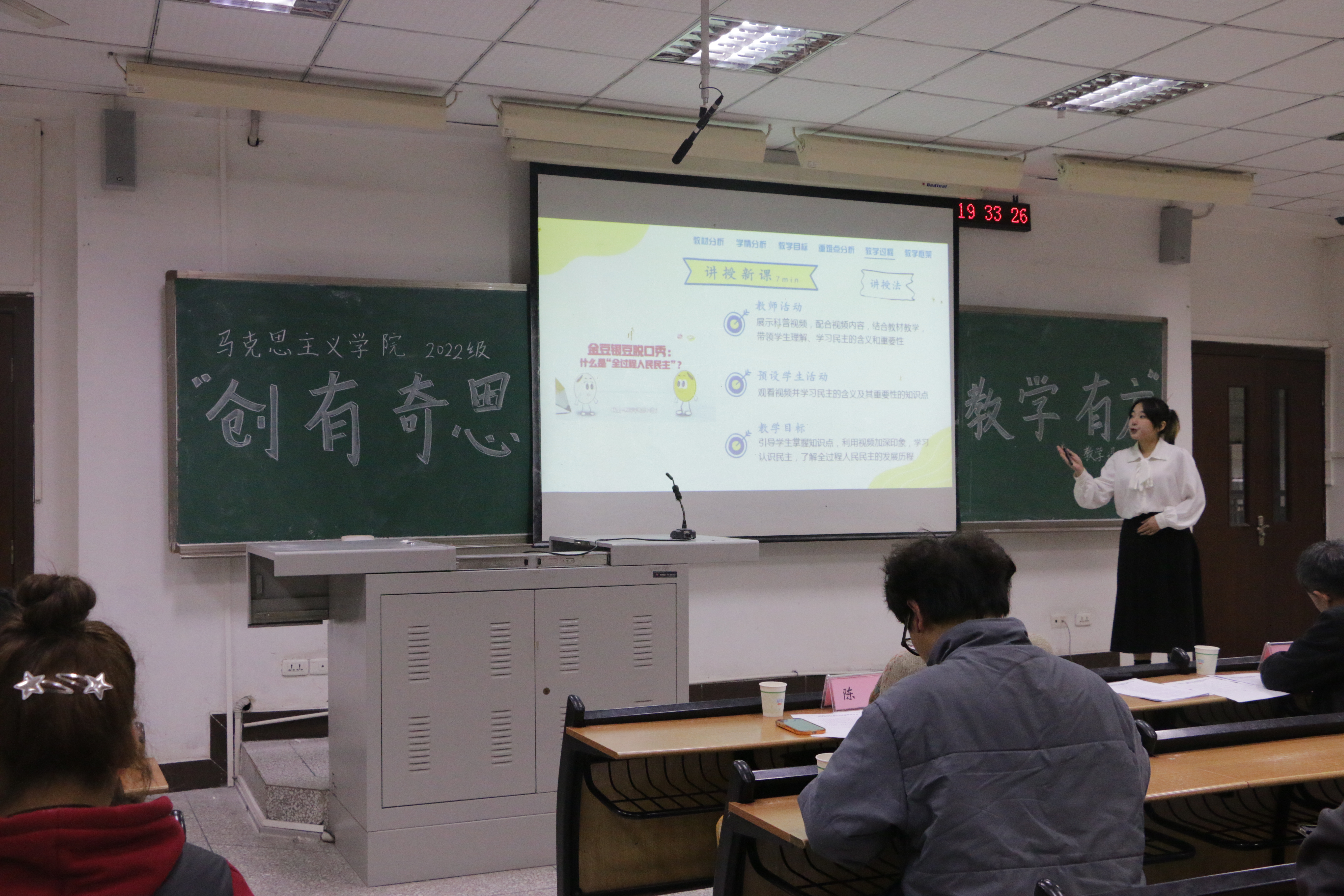 本次比赛以员工个人为单位报名参赛,要求选择初、高中阶段思政课教材某一章节内容进行教学设计,并制作PPT进行展示汇报。既加强了2022级员工对初高中教材的理解和对教学设计的熟悉,又锻炼了员工在短时间内制作多媒体课件的能力。比赛分为初赛与决赛两个阶段。在11月中旬抽签分为4组举行了初赛,选拔出12名同学进入决赛。