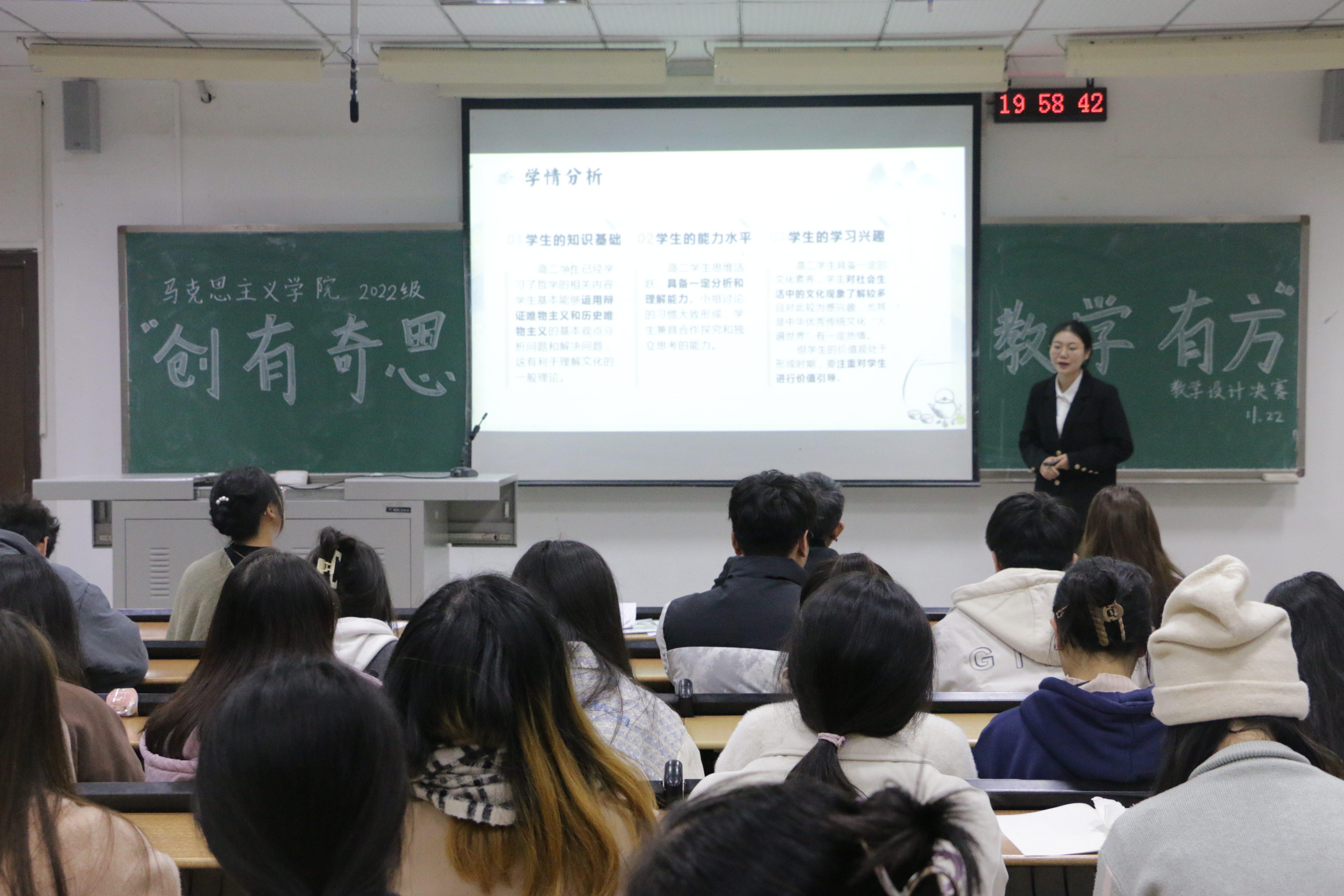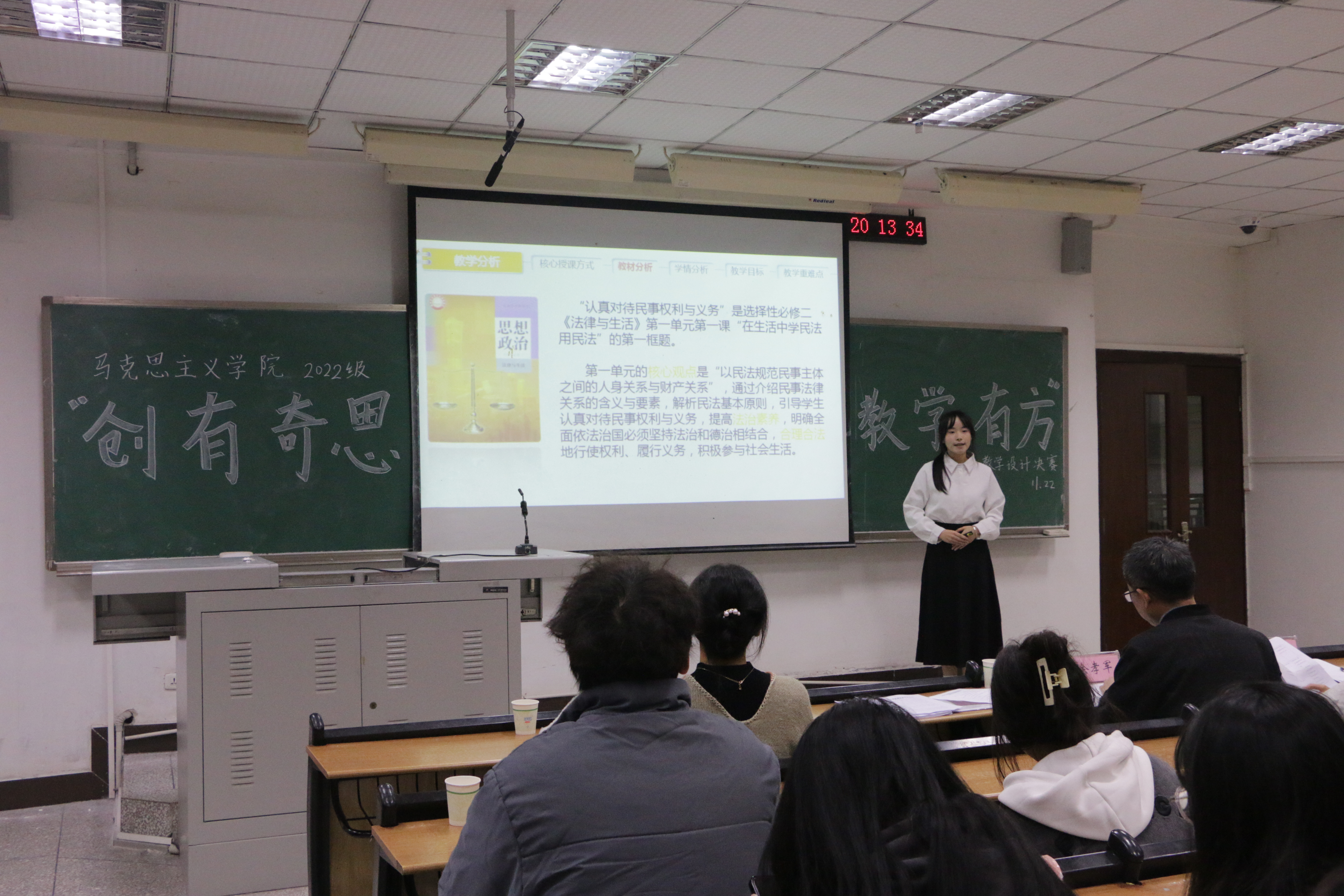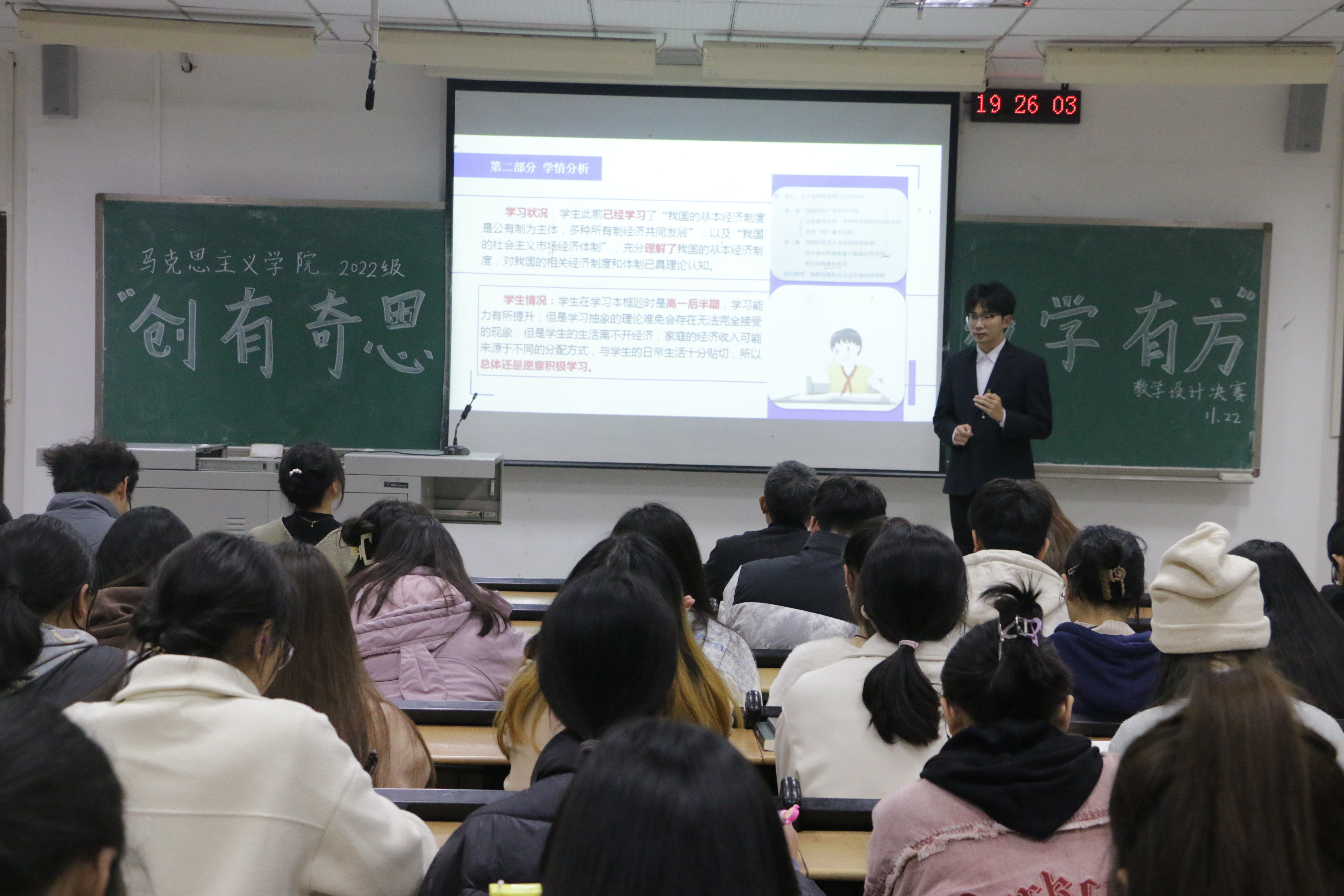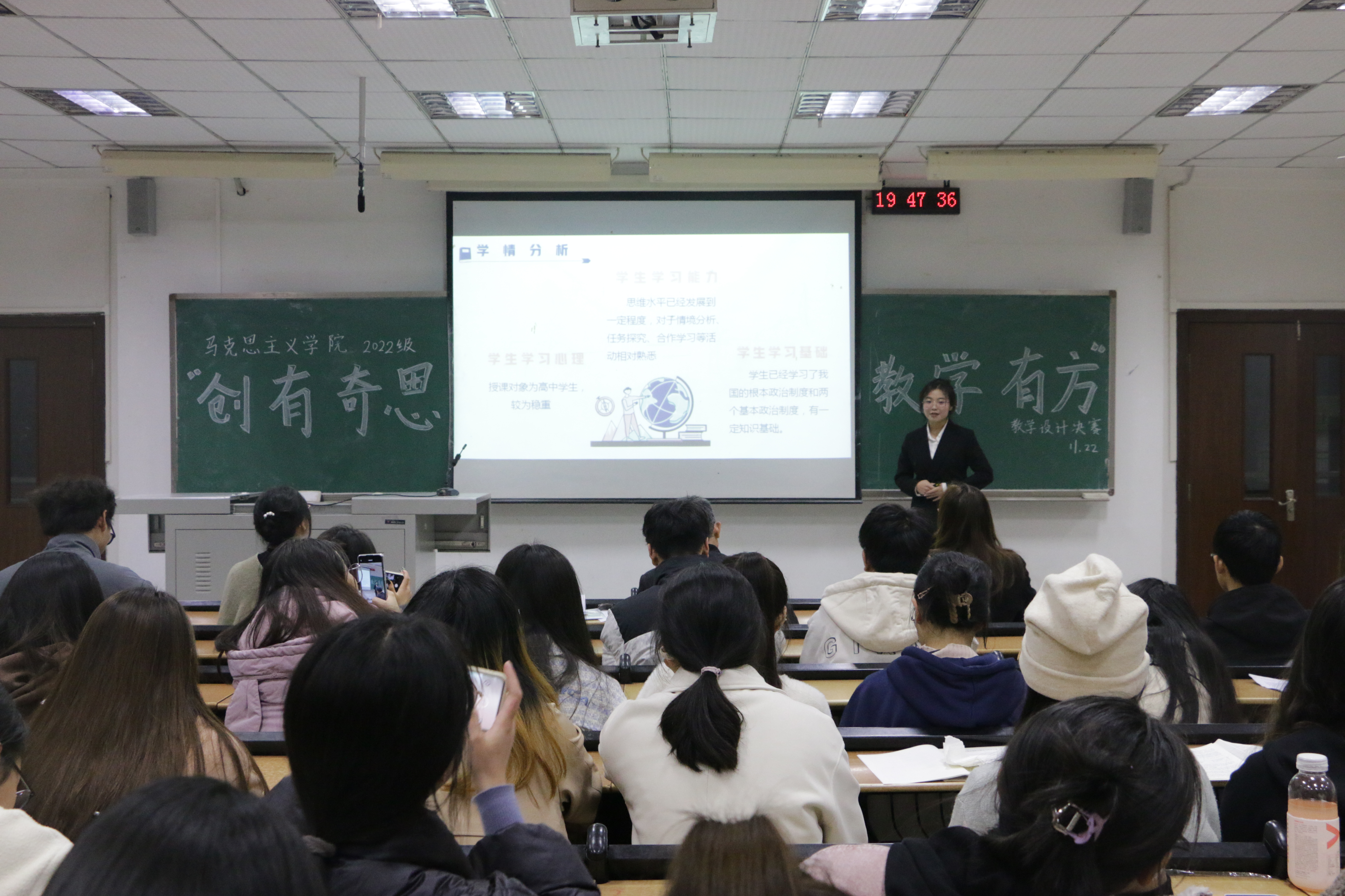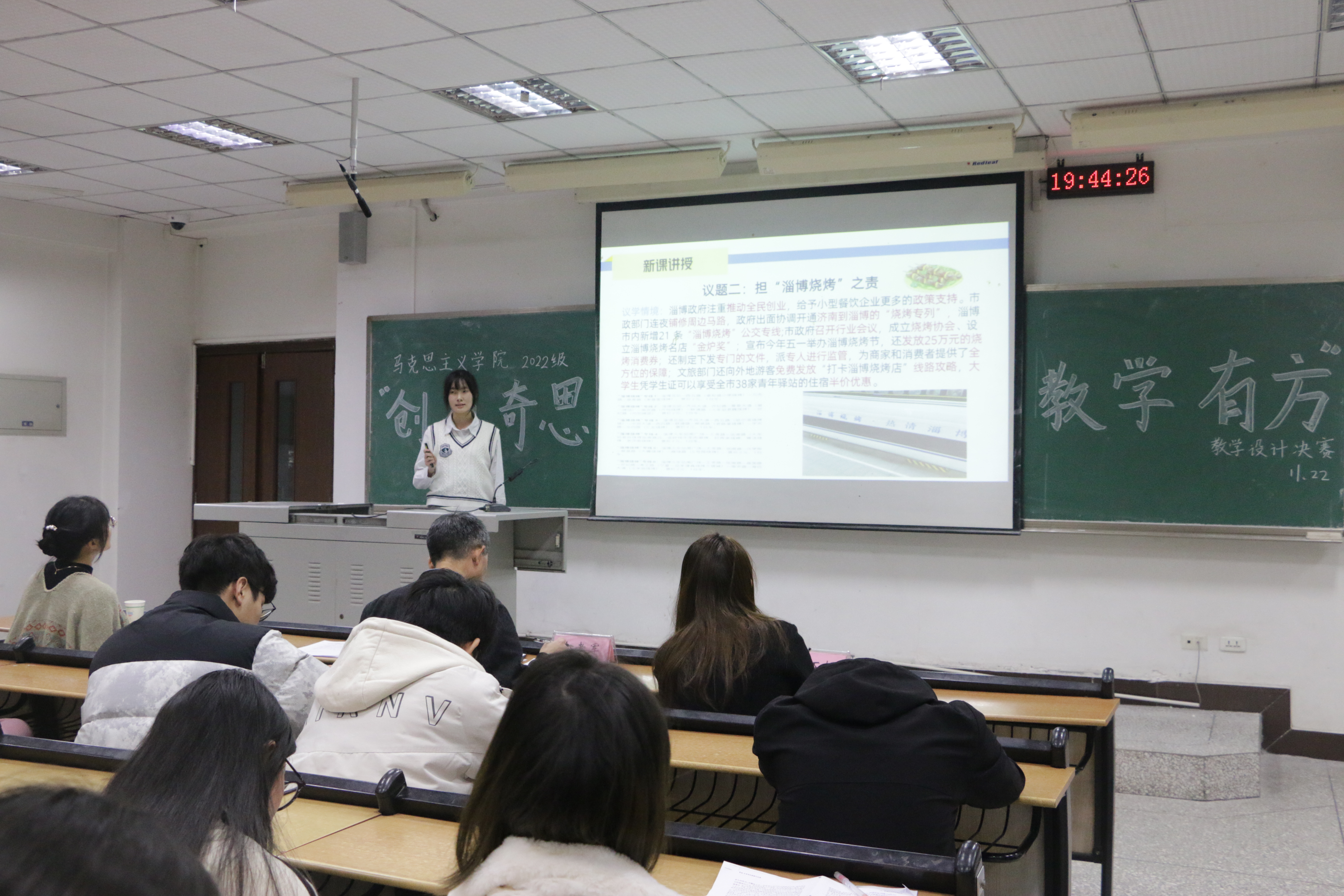 本次比赛以员工个人为单位报名参赛,要求选择初、高中阶段思政课教材某一章节内容进行教学设计,并制作PPT进行展示汇报。既加强了2022级员工对初高中教材的理解和对教学设计的熟悉,又锻炼了员工在短时间内制作多媒体课件的能力。比赛分为初赛与决赛两个阶段。在11月中旬抽签分为4组举行了初赛,选拔出12名同学进入决赛。