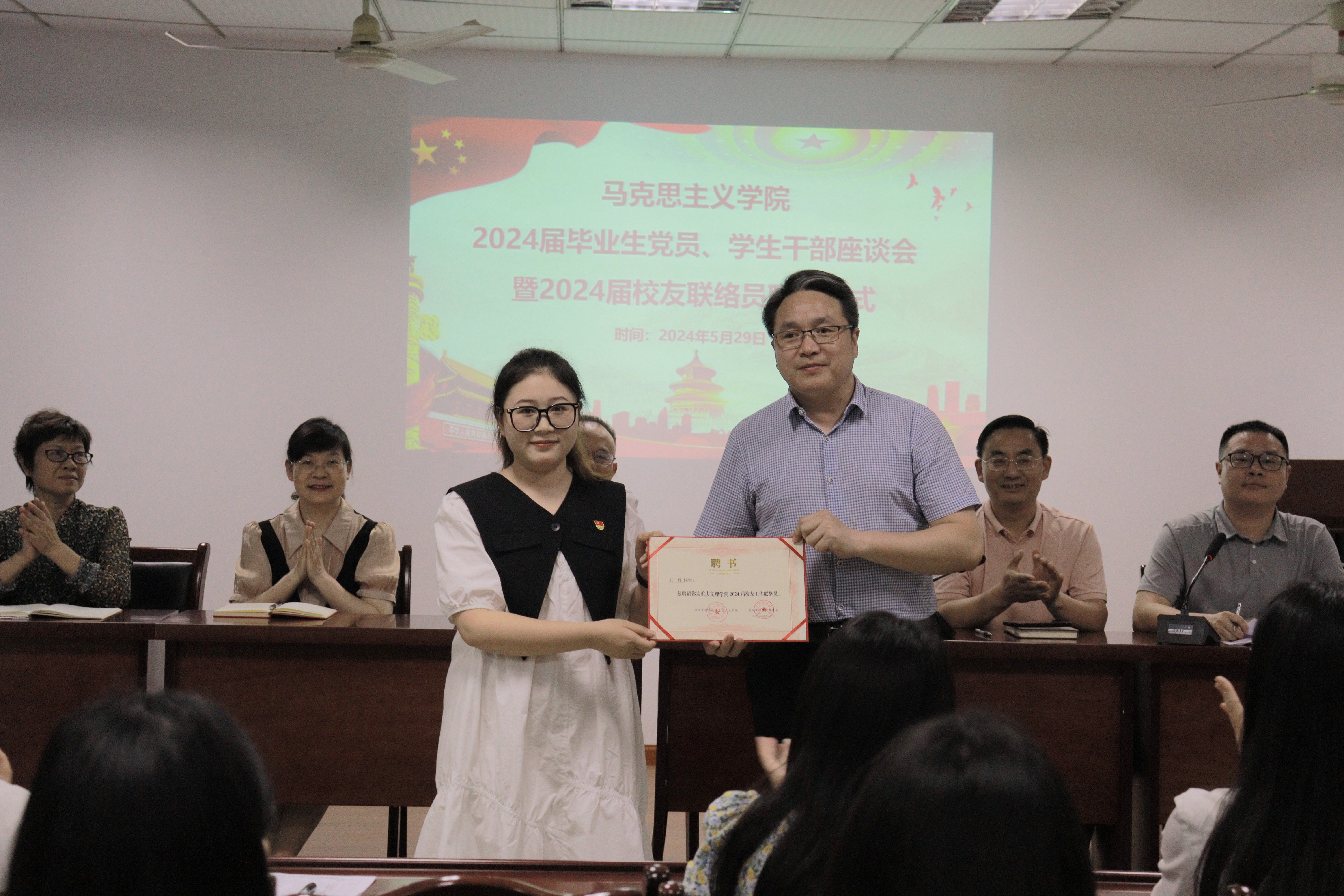 5月29日,j9九游会在知津楼C205会议室举行2024届毕业生党员、员工干部座谈会暨2024届员工联络员聘任仪式,j9九游会党委书记杨正强,党委副书记、经理胡守敏,党委副书记、纪委书记、副经理李景国,副经理张莉,学工办主任、团委书记李华夏及辅导员参加座谈会。座谈会由李华夏主持。