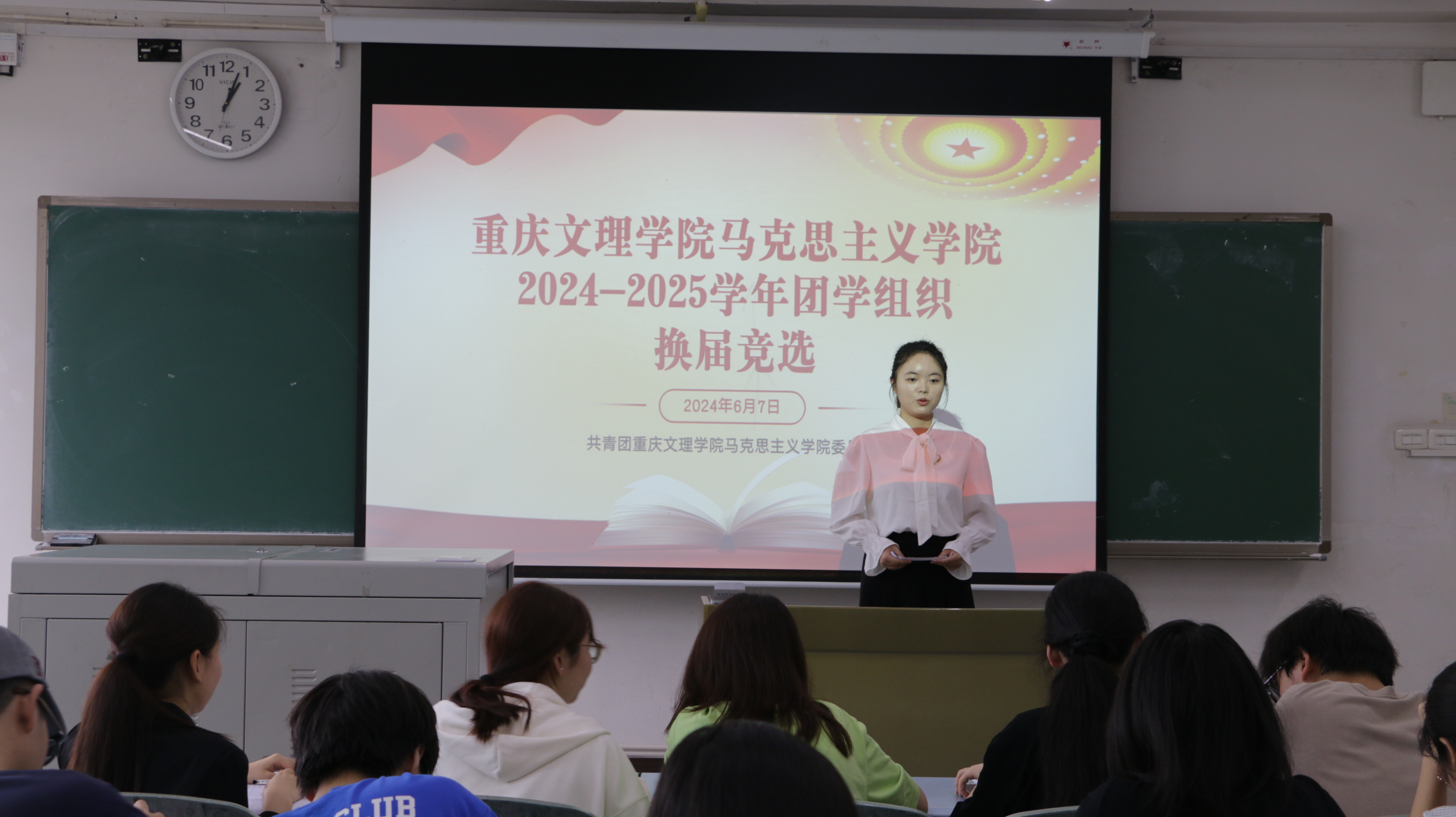 2022年6月7日上午,j9九游会第五届团学组织主席团和部门换届大会分两段在知津楼顺利举行。辅导员张善英、黄慧敏,学院团学组织各部门干部及岗位竞聘者共计70余人参加。