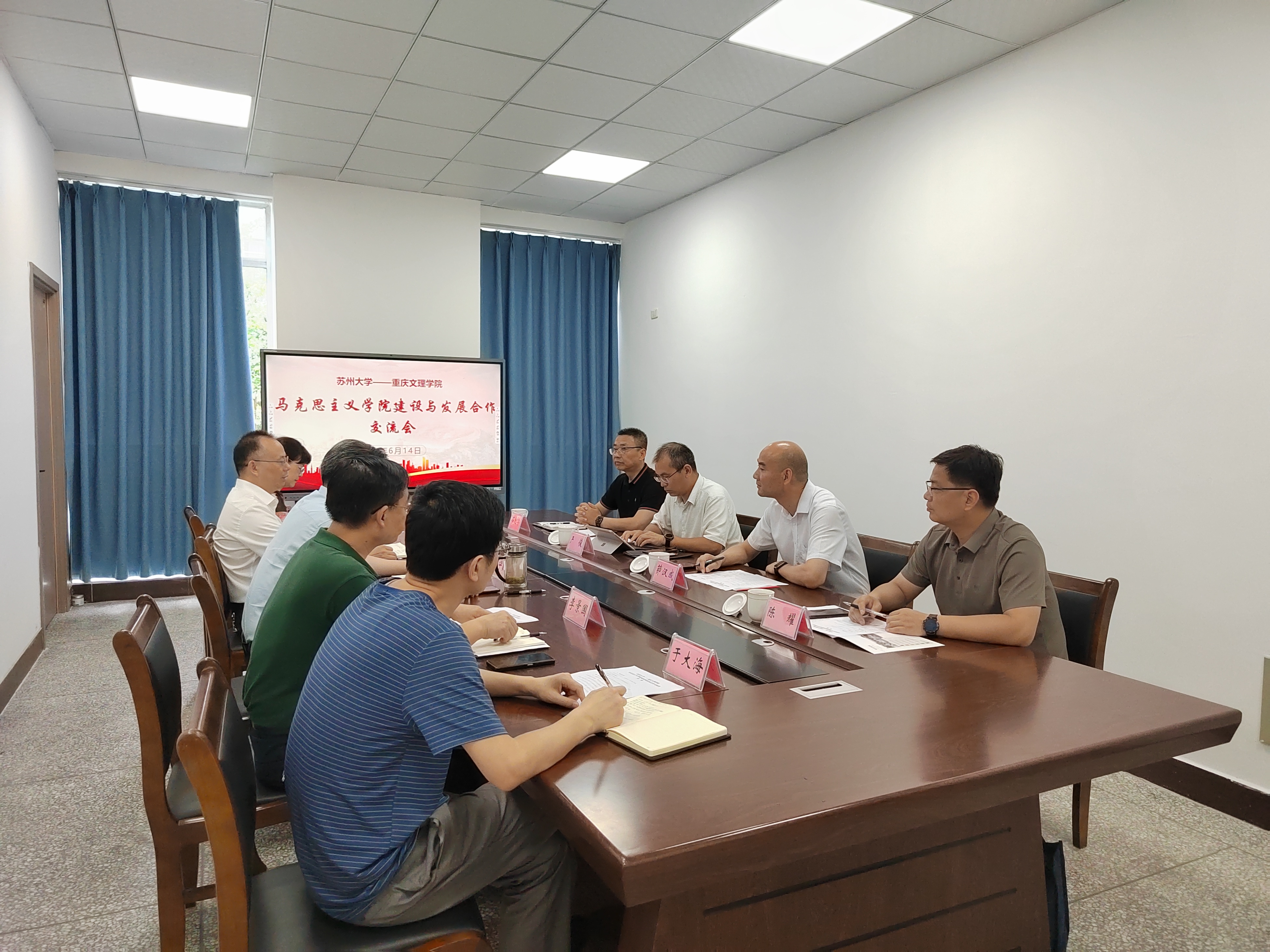 胡守敏对苏州大学一行来访表示热烈欢迎,并就学院专业建设、学科规划、公司产品、团队队伍培养、重庆市级平台建设及大中小学思政课一体化建设等基本情况进行了介绍。 杨正强结合学院建设和发展,从党建引领、人才培养、服务地方等方面的具体做法和经验,进行了交流和发言。
