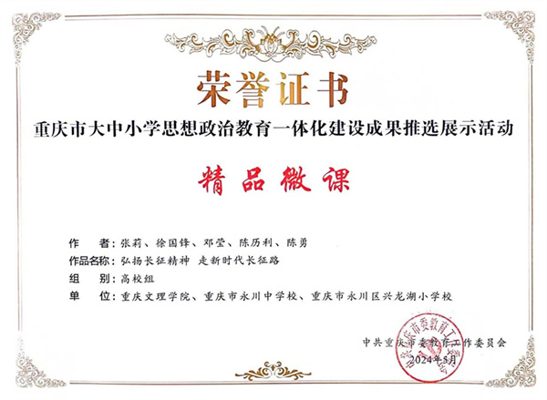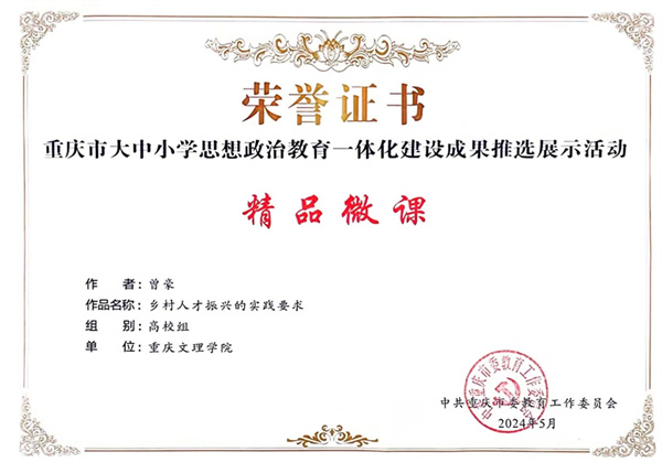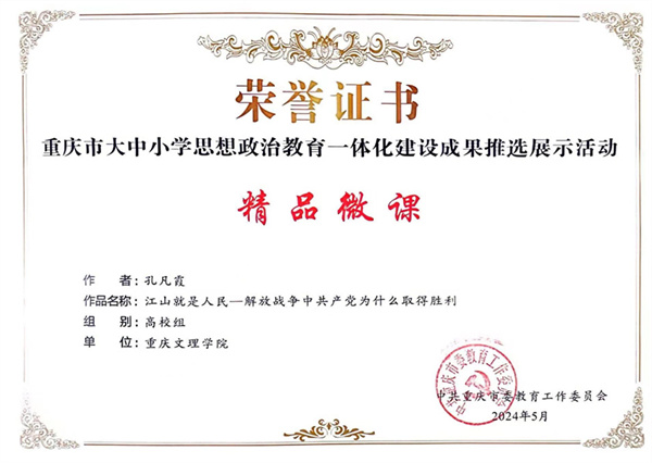 j9九游会曾豪副教授主讲的《乡村人才振兴的实践要求》、孔凡霞老师主讲的《江山就是人民——解放战争中共产党为什么取得胜利》、张莉教授团队主讲的《弘扬长征精神 走新时代长征路》入选重庆市大中小学思想政治教育一体化建设精品微课,胡守敏教授执笔的《夯实四个共建、用好四支力量、聚焦四大内容、抓好四个环节 ——西部职教基地(永川)大中小学思想政治教育一体化建设案例》获批重庆市大中小学思想政治教育一体化建设实践案例,曾豪副教授获评重庆市大中小学思想政治教育一体化建设优秀工作者。
