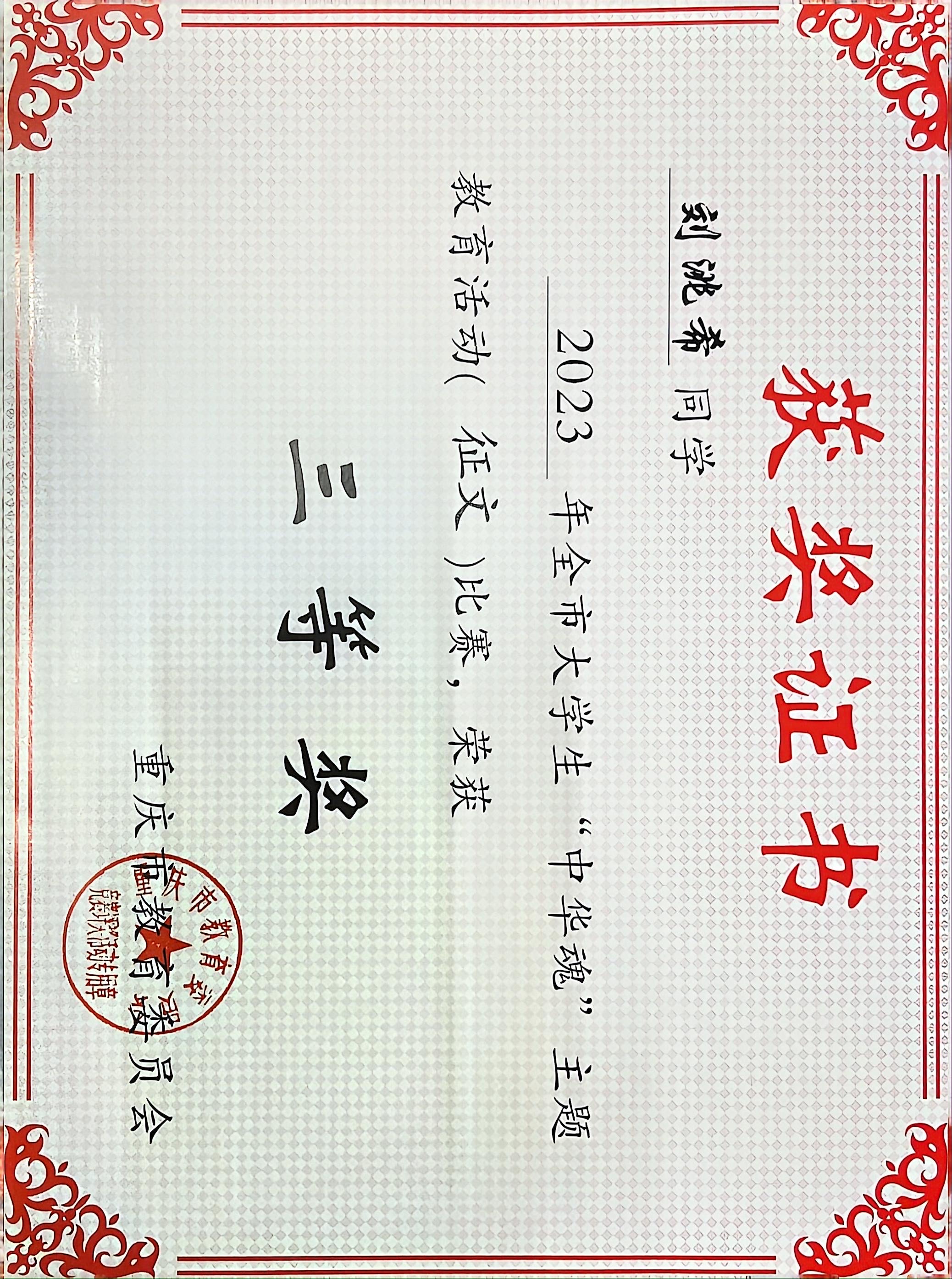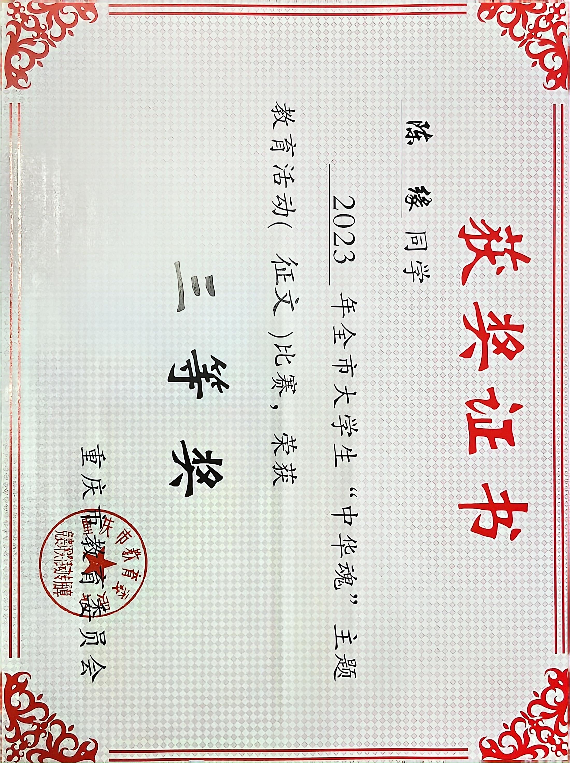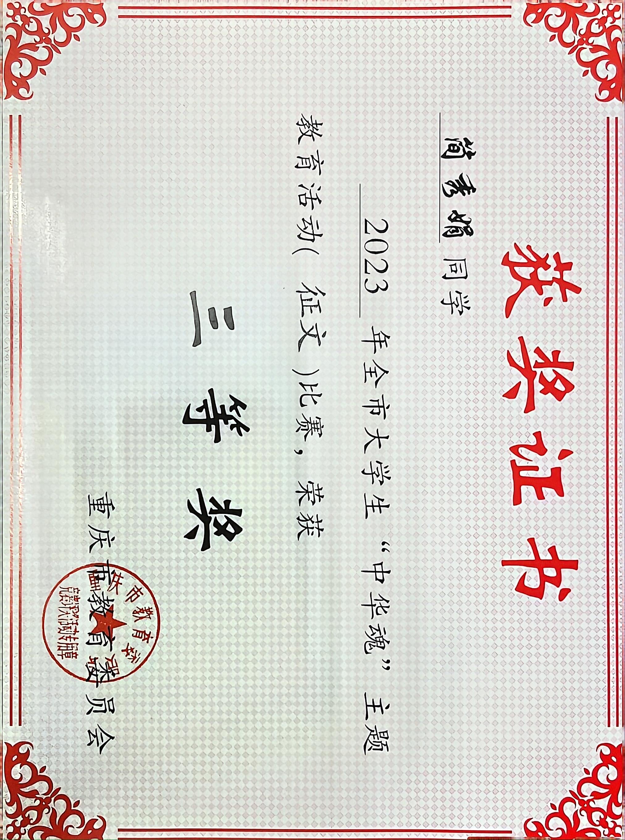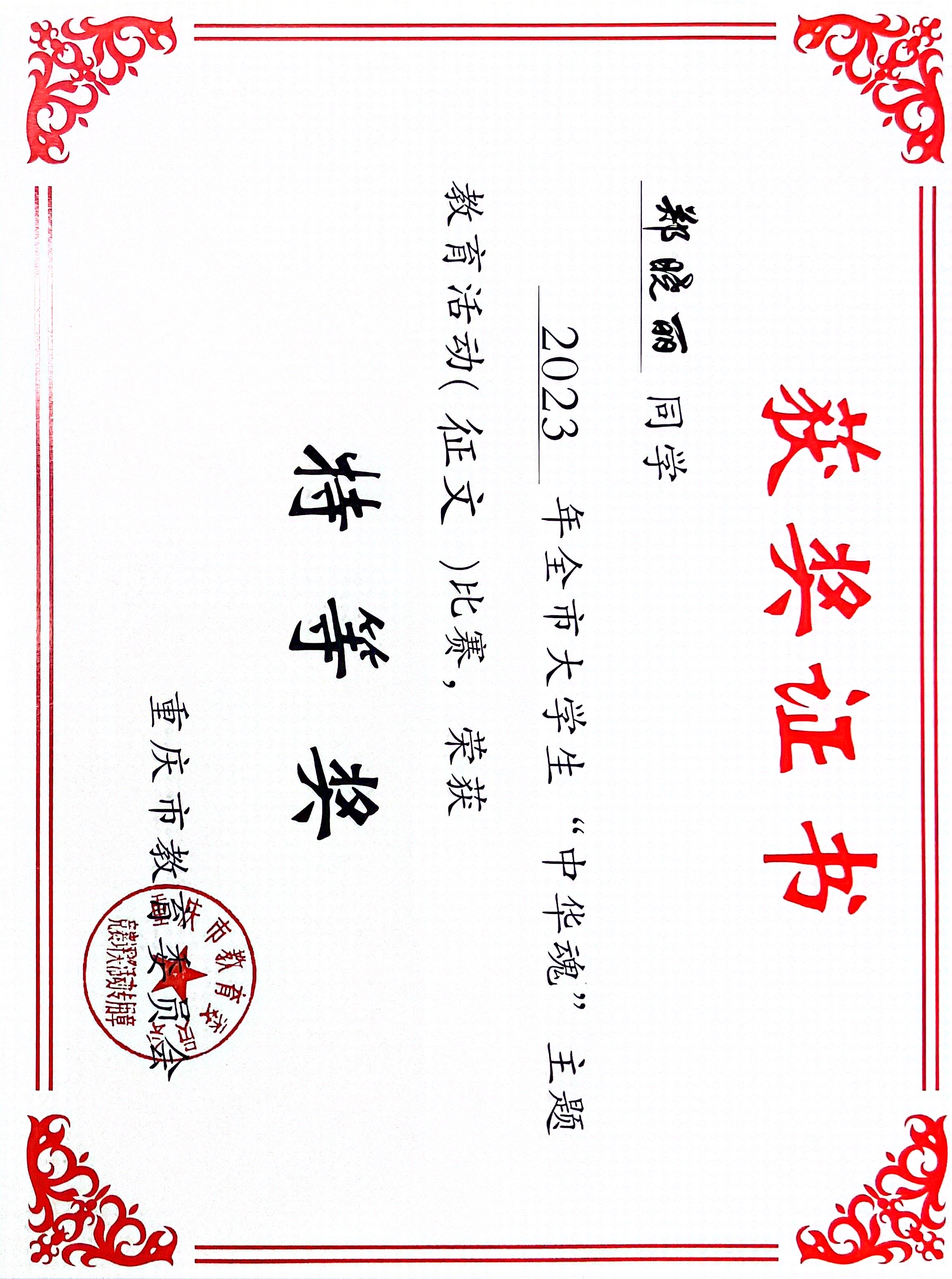 近日,重庆市教育委员会组织开展的老员工“中华魂”主题教育活动比赛结果揭晓,九游会j9组织师生积极参与,并获佳绩。其中郑晓丽同学获得全市老员工“中华魂”主题教育活动(征文)比赛特等奖,简秀娟、刘洮希、陈缘三位同学获得三等奖。李华夏、伍沈平两位老师获得全市老员工“中华魂”主题教育读书活动“优秀辅导员”荣誉称号。