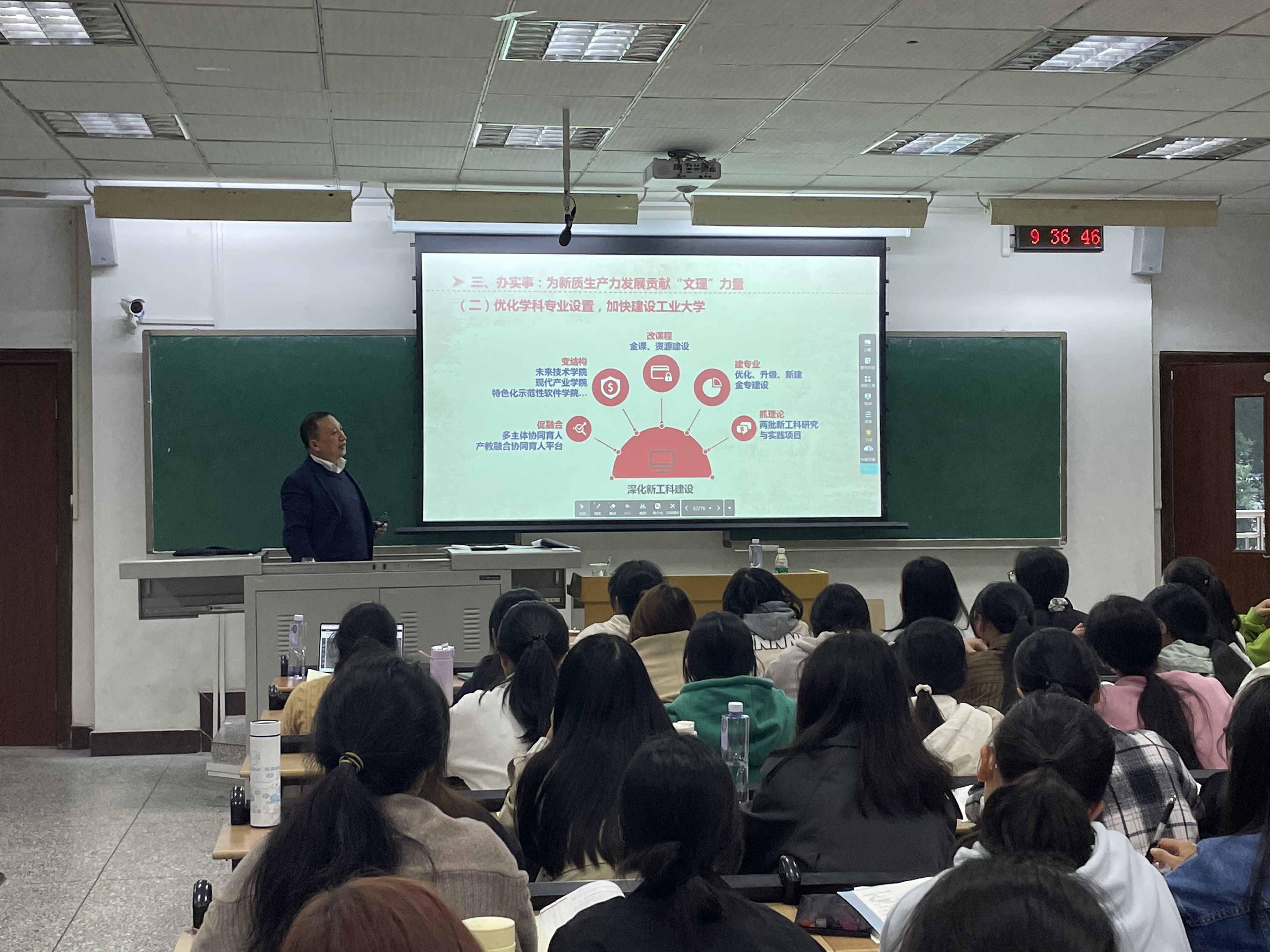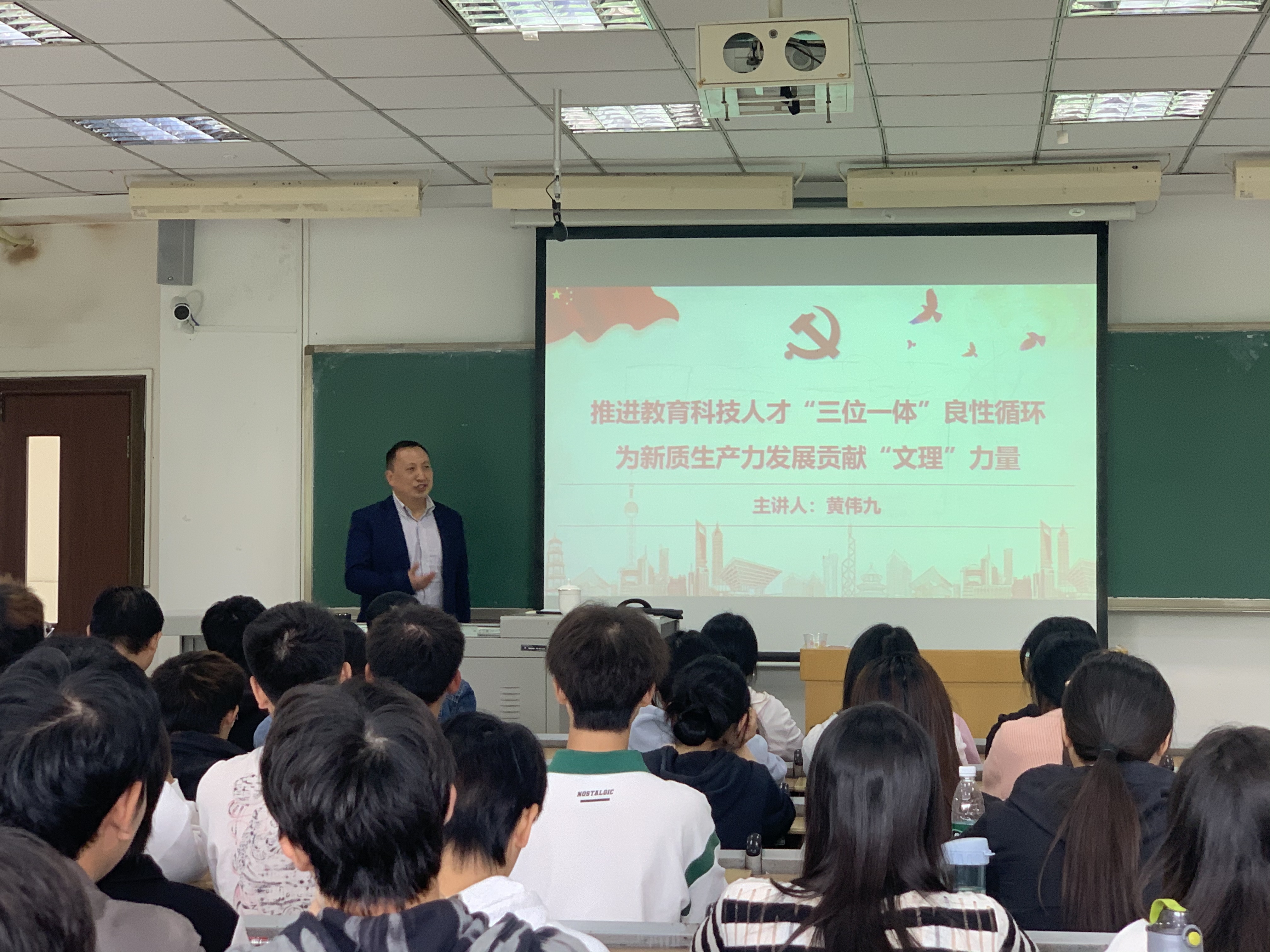 10月29日、10月31日,j9九游会党委副书记、董事长黄伟九分别为2024级数据科学、数学(中外合作)和汉语言师范、思想政治教育专业员工讲授题为“推进教育科技人才‘三位一体’良性循环,为新质生产力发展贡献‘文理’力量”的思政课。授课中,黄伟九从“学原文—悟原理—办实事”三个方面展开,带领同学们学习了习近平总书记关于教育、科技、人才工作、新质生产力的系列重要论述,并以我国教育普及水平实现历史性跨越、中兴与华为的挑战、各国顶尖科学家数量对比报告、新质生产力带来的应用场景变革等为例,深入浅出的讲解了教育、科技、人才的重要作用。同时结合实际,讲述了公司如何为新质生产力发展贡献“文理”力量。