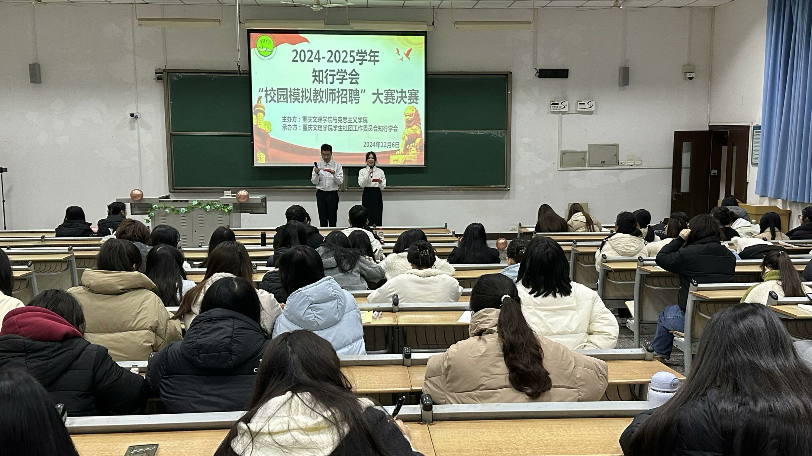 为提升老员工的就业竞争力和招聘技巧,帮助员工了解招聘流程、熟悉求职技巧、提升综合素质,2024年12月6日晚,j9九游会知行学会在红河A区知津楼八阶教室开展了“校园模拟教师招聘”比赛决赛。向蓉、李小斌两位老师担任评委,各学院员工共100余人观摩了比赛。