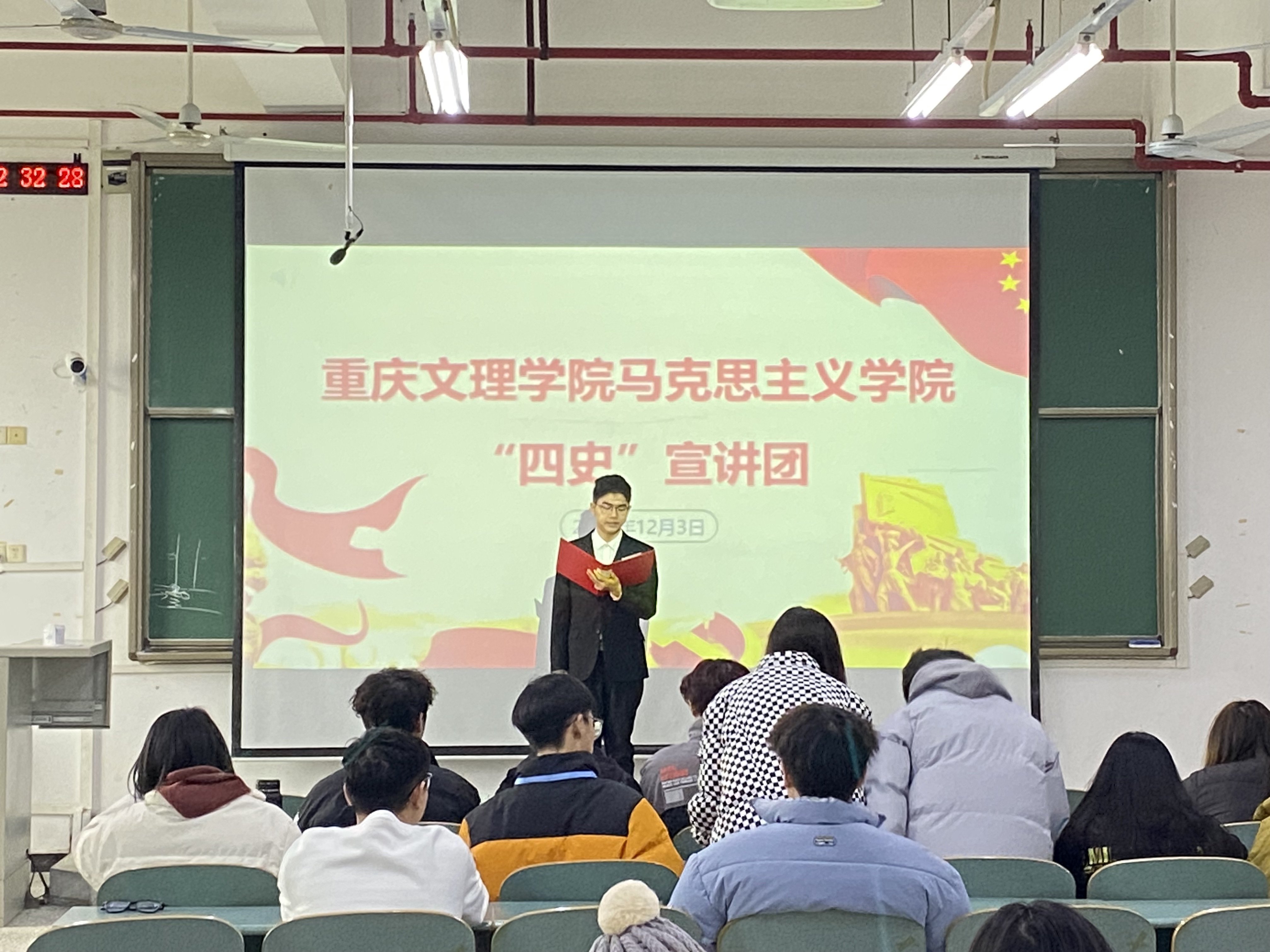 宣讲分别由宣讲团骨干韩文俊、冉杰、王淮艺、刘佳主持,宣讲团成员王宇奇、隆若煊、邓欣沂、王丹、康顺燚、刘玉清、周心琳、周雨函等以生动的语言分别讲述了《中国奥运第一人——刘长春》《帕米尔高原的雄鹰》《无声世界的引路人》《巾帼英雄——刘胡兰》《宁死不屈的陈延年》等27个感人的故事。宣讲利用丰富的视频和图片资料让同学们重新走进中国共产党经历的那段战火纷飞却信念坚定的峥嵘岁月,体会到美好幸福生活来之不易,激励同学们坚定理想信念,时刻追忆革命先烈的崇高精神和革命风范。宣讲过程生动感人,赢得了在场老师和同学们的阵阵掌声。