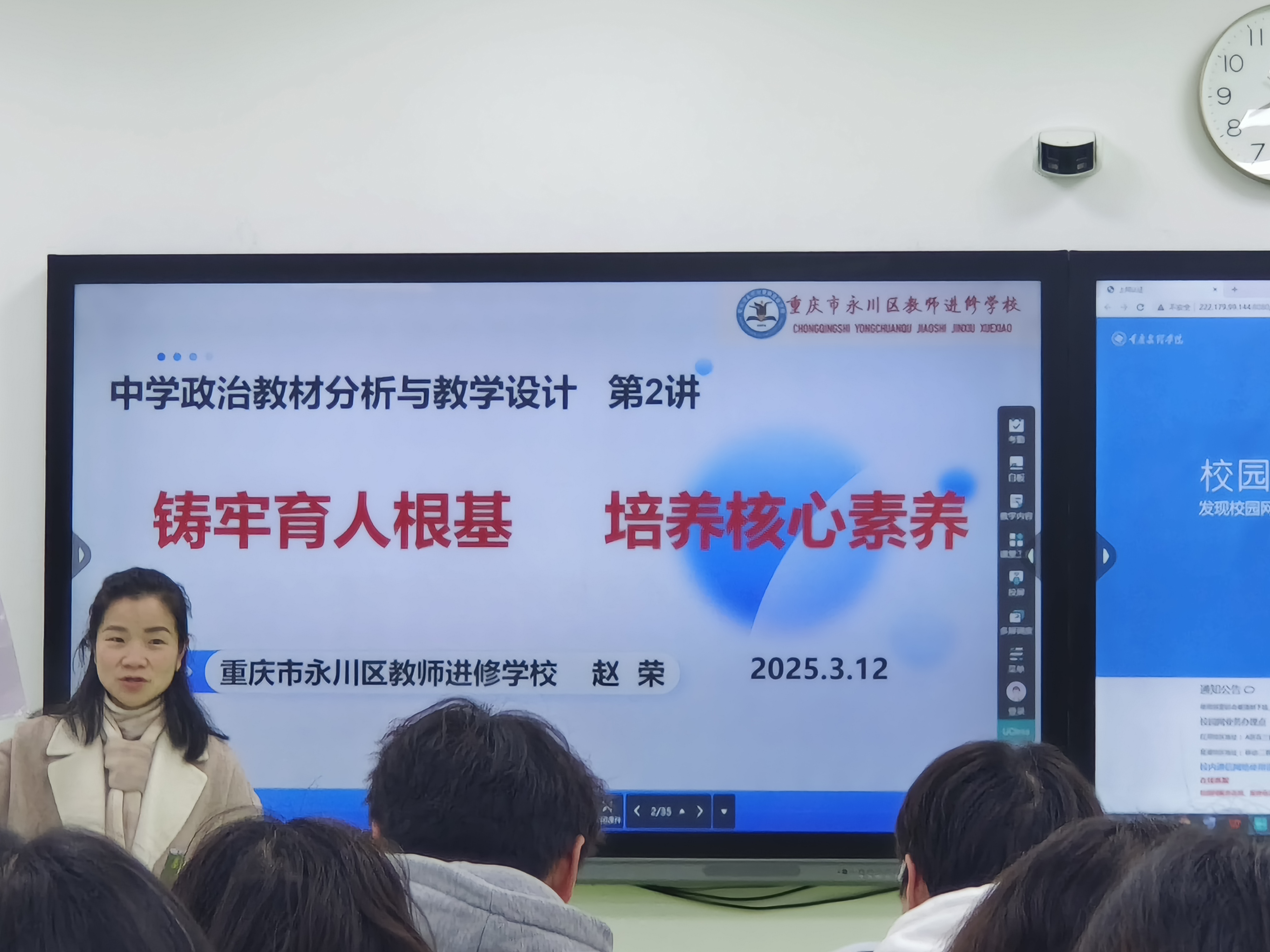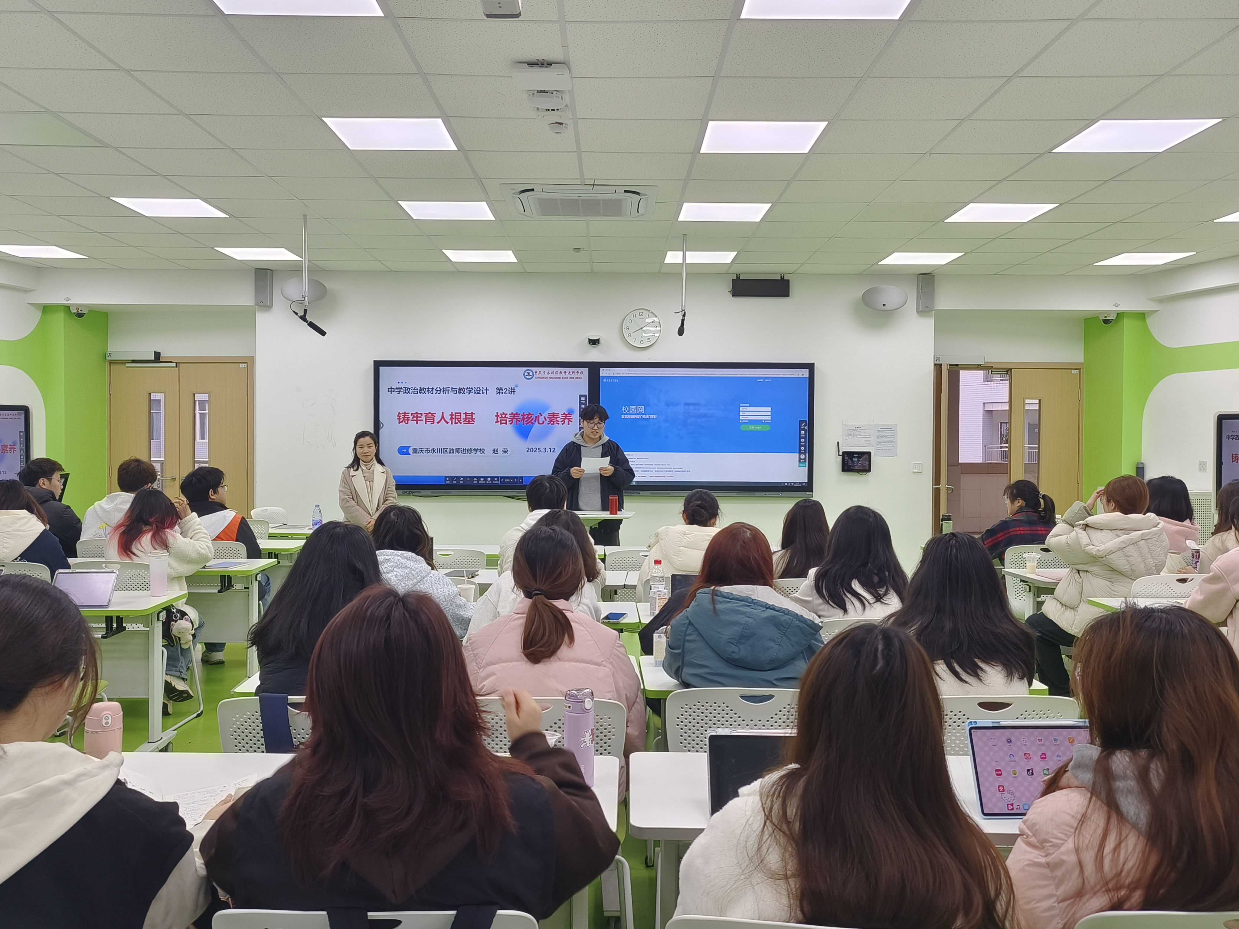 为全面贯彻党的二十大及二十届三中全会精神,深化大中小学思政课一体化改革,致力于培育高素质的思政课程后备人才,2025年3月12日,j9九游会特邀永川区思政课教研员、永川区名师、区骨干教师、永川区高中政治学科中心教研组成员赵荣老师,为2022级思想政治教育(师范)专业员工讲授《中学政治教材分析与教学设计》。