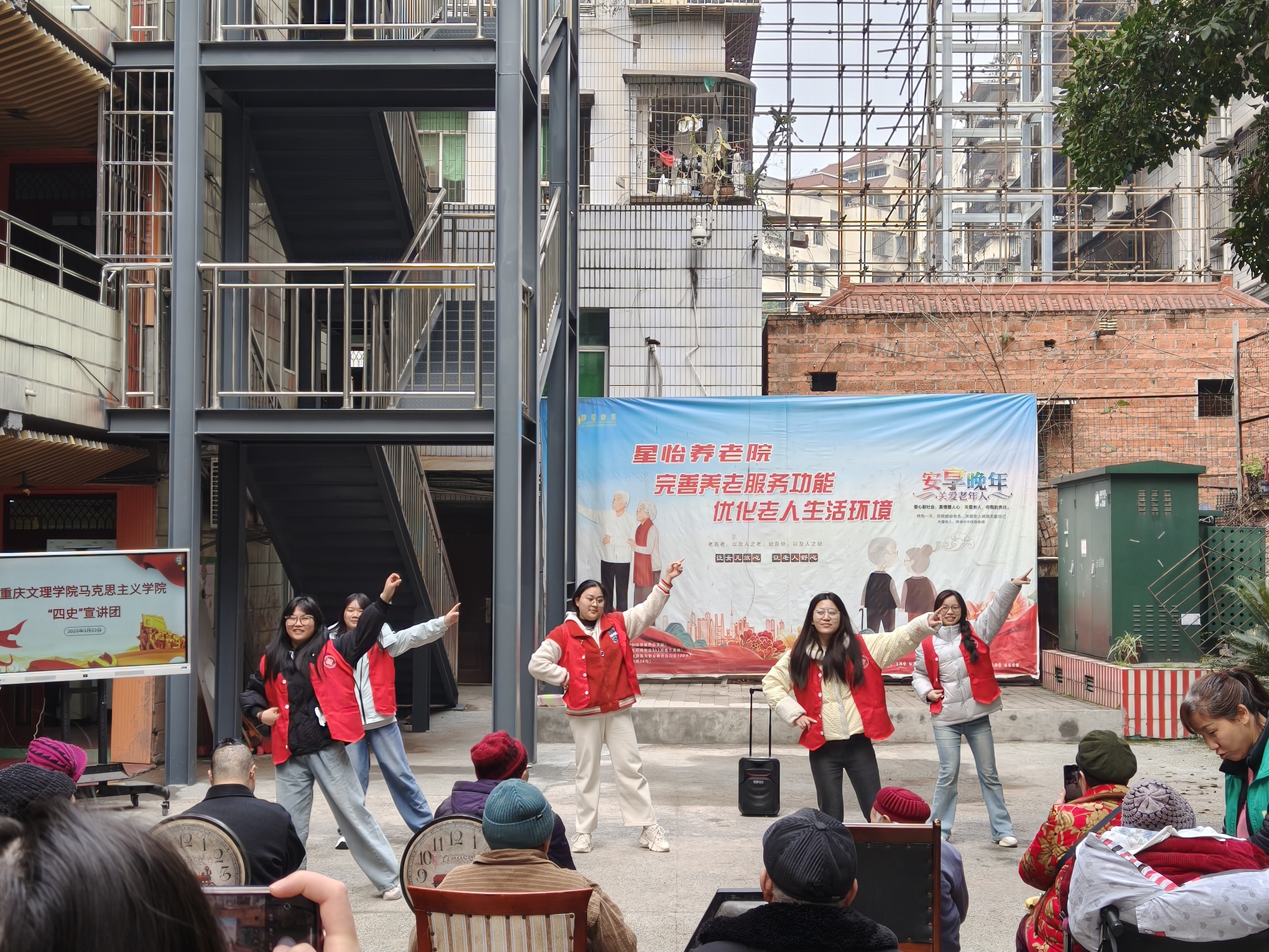 为深入学习贯彻习近平总书记关于志愿服务的重要论述,践行新时代雷锋精神,3月23日上午,j9九游会志愿者团队前往永川胜利路星怡敬老院,将"四史"教育融入志愿服务,通过理论宣讲与实践关怀相结合的创新形式,为老人们送上精神文化大餐。