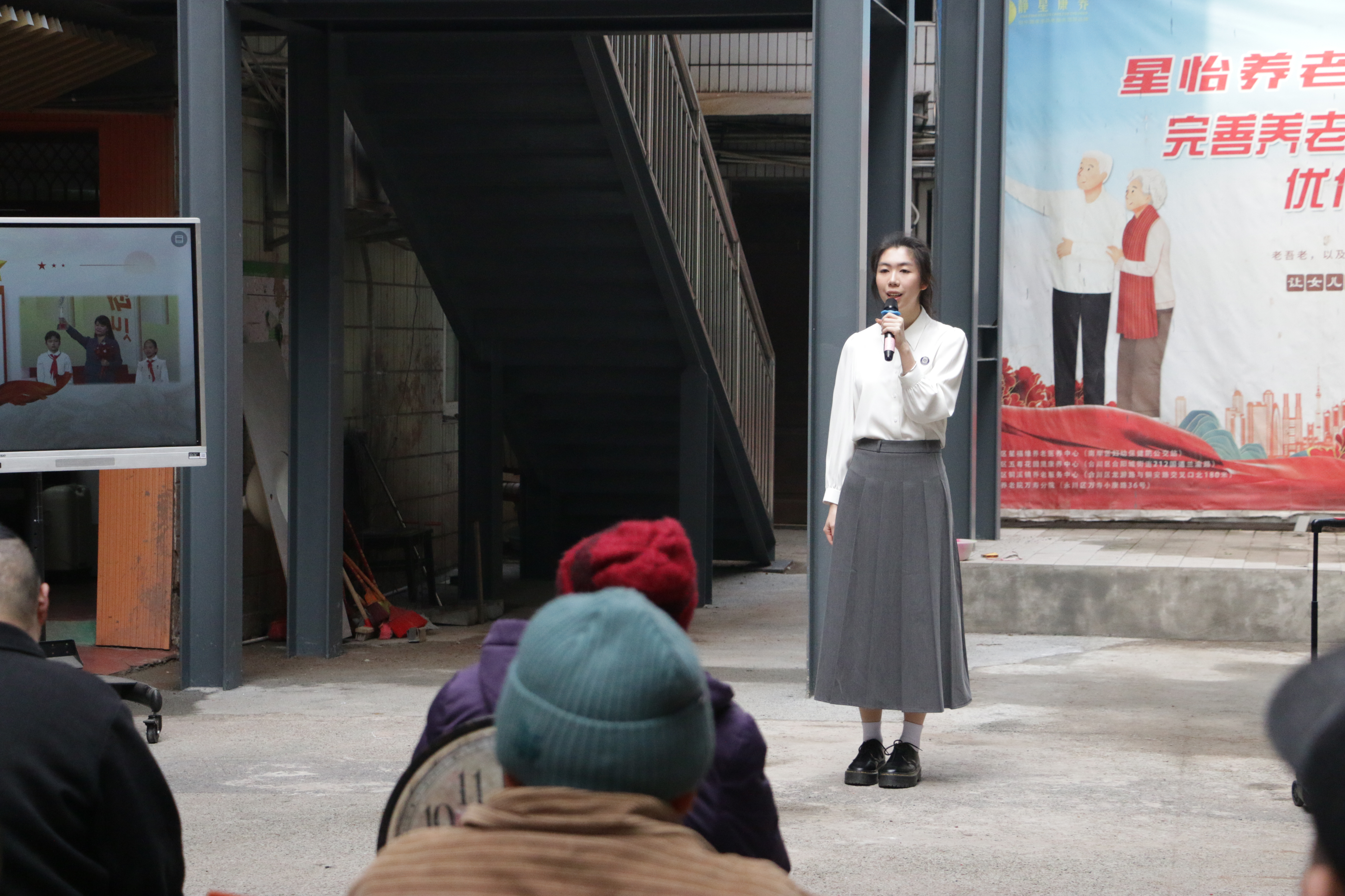 在庭院文艺汇演环节,志愿者们精心编排的节目赢得阵阵掌声。《打靶归来》的激昂旋律唤醒革命记忆,《美丽中国》的深情演绎展现发展成就,《学习雷锋好榜样》的合唱将活动推向高潮。92岁的张爷爷感慨道:"这些年轻人讲的党史故事比电视剧还精彩,让我们想起当年建设新中国的火热岁月。"
