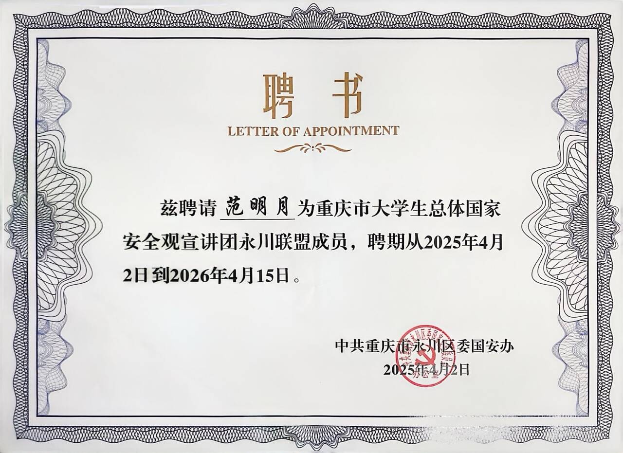 2025年4月2日,由区委宣传部、区委政法委、区委国安办、区委网信办、区教委、团区委联合主办的“全民国家安全教育 走深走实十周年”老员工主题演讲比赛,在重庆城市科技学院落下帷幕,本次比赛吸引了ag九游会、重庆城市科技学院等8所在永高校的25名员工参与。公司员工范明月以《以青春之名,筑国防长城》为题,凭借扎实的理论功底和富有感染力的现场表现获得了二等奖,被聘为“重庆市老员工总体国家安全观宣讲团永川联盟成员”,展现了公司学子过硬的基本功和良好的综合素质,赢得了评委和观众的高度认可。