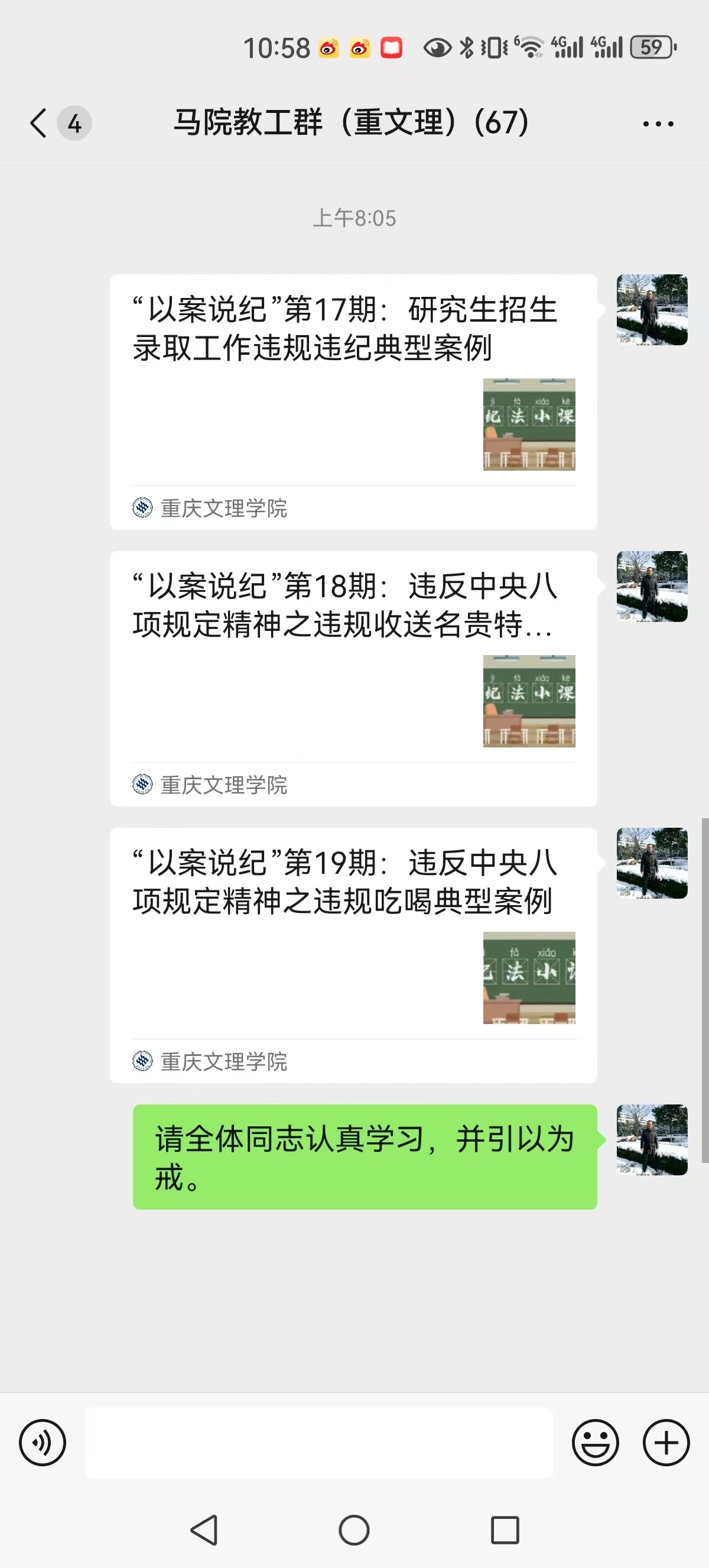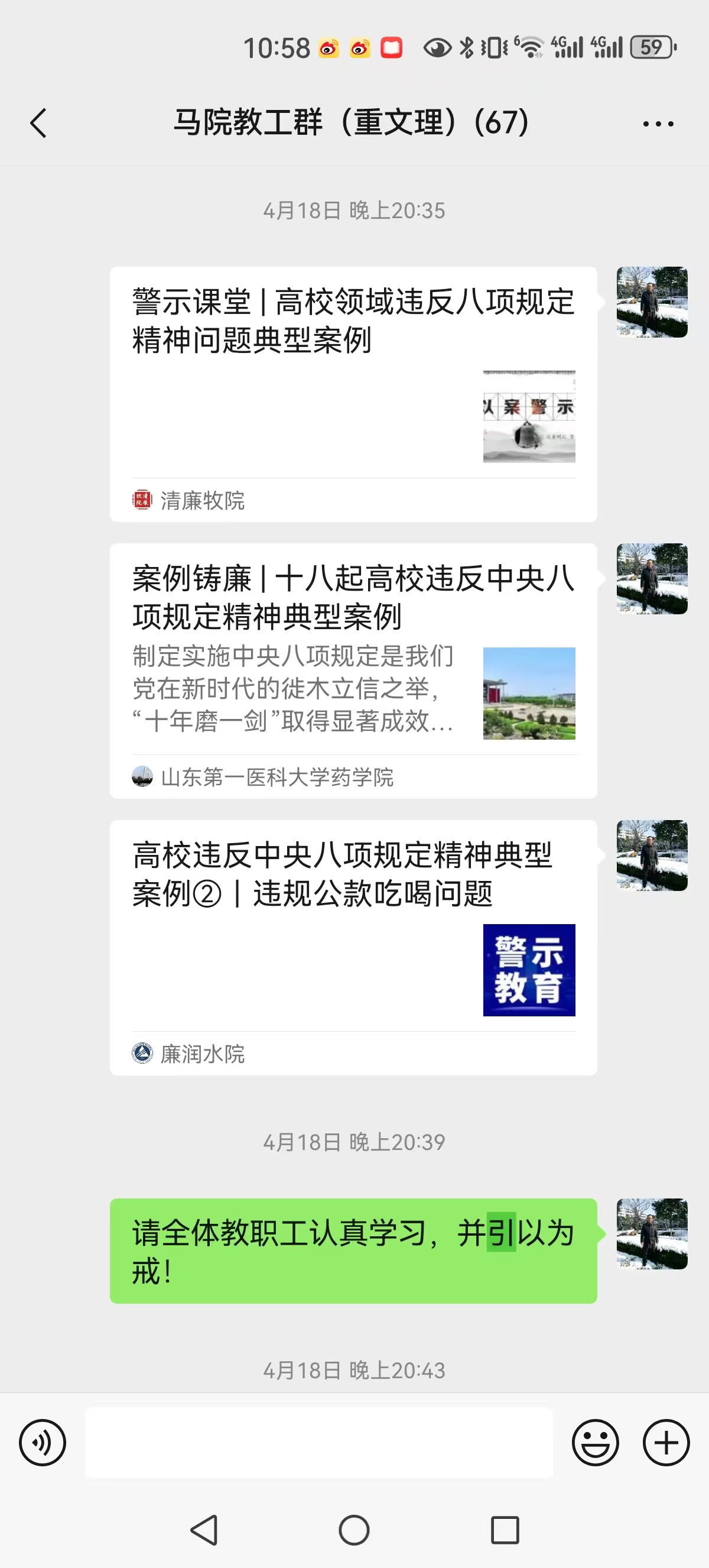 自3月以来,学院还充分利用工作群这一便捷的沟通平台,积极开展线上警示教育。累计转发违反中央八项规定精神典型案例20余条,涵盖100余个具体案例。这些案例以图文并茂、生动详实的形式呈现,让教职工们能够利用碎片化时间随时随地进行学习,使廉洁教育真正融入到日常工作生活中,时刻提醒大家要严格自律,不触纪律红线。